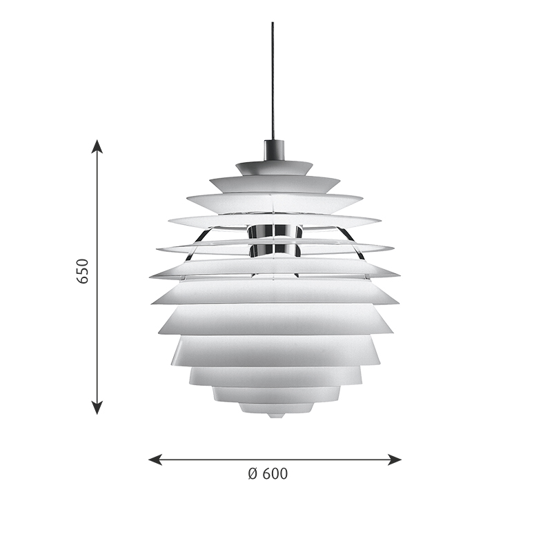 Louis Poulsen, le luminaire fournit un éclairage sans le moindre éblouissement. Sa forme sphérique est destinée à éclairer toutes les surfaces environnantes au même angle, ce qui engendre une lumière uniforme, tant sur les murs qu’au plafond. Les surfaces intérieures sont mates tandis que les surfaces supérieures sont brillantes afin de créer des reflets de lumière et, de ce fait, de diffuseur la lumière de manière homogène autour de la