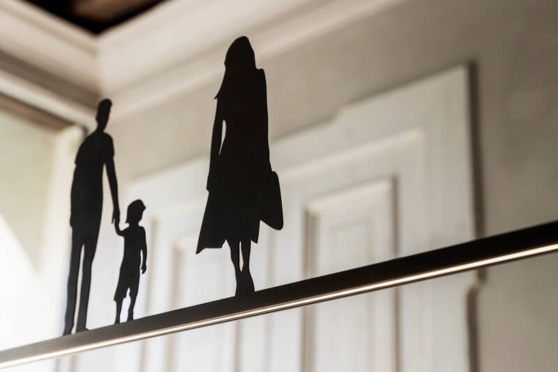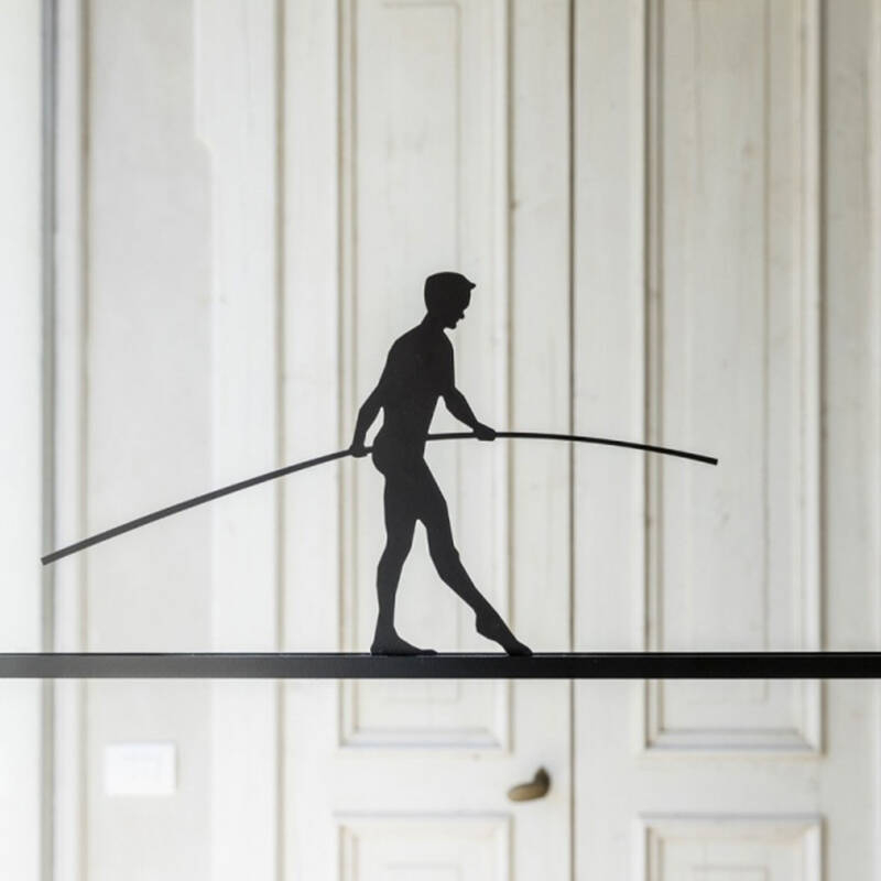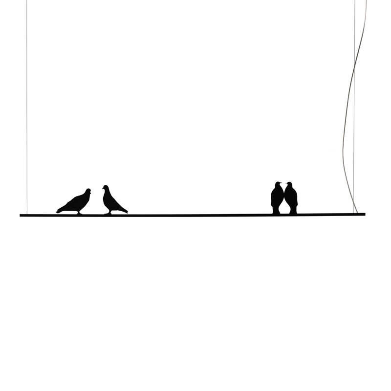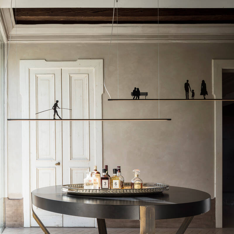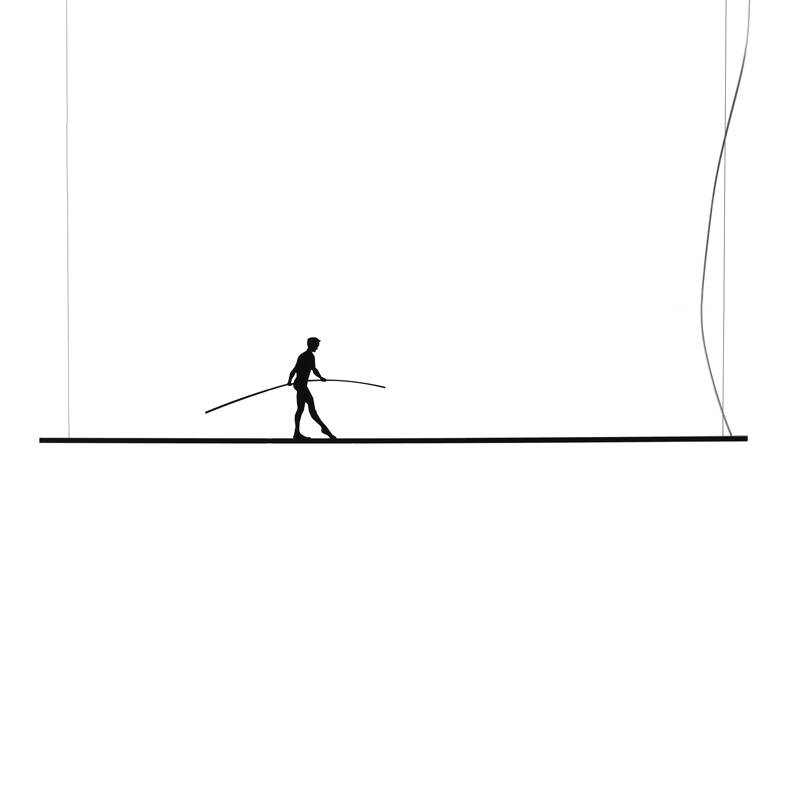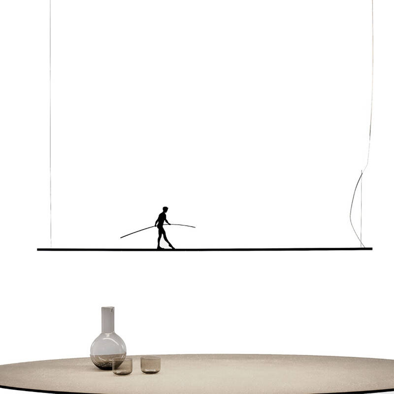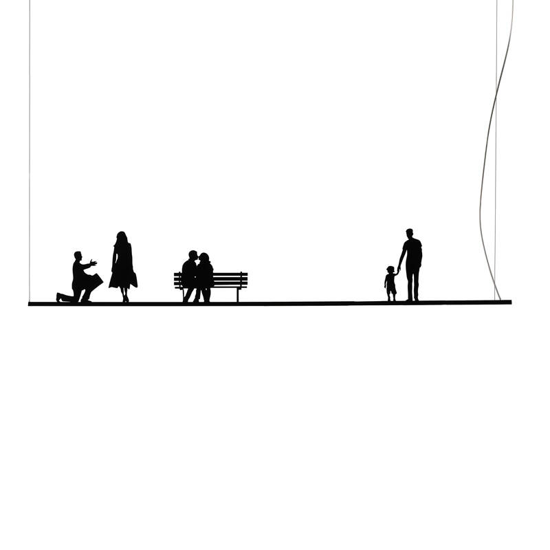 Phil est une suspension en métal noir, imaginé comme un fil tendu dans l’espace et traversé par des histoires. Cette lampe graphique et légère oscille entre fantaisie et réalité. Des silhouettes rétroéclairées se détachent dans l’espace et racontent des histoires d’entreprises impossibles ou de la vie de tous les jours. Les silhouettes peuvent être placées où vous le souhaitez sur toute la longueur de la suspension. Disponible avec différents kits de silhouettes, la