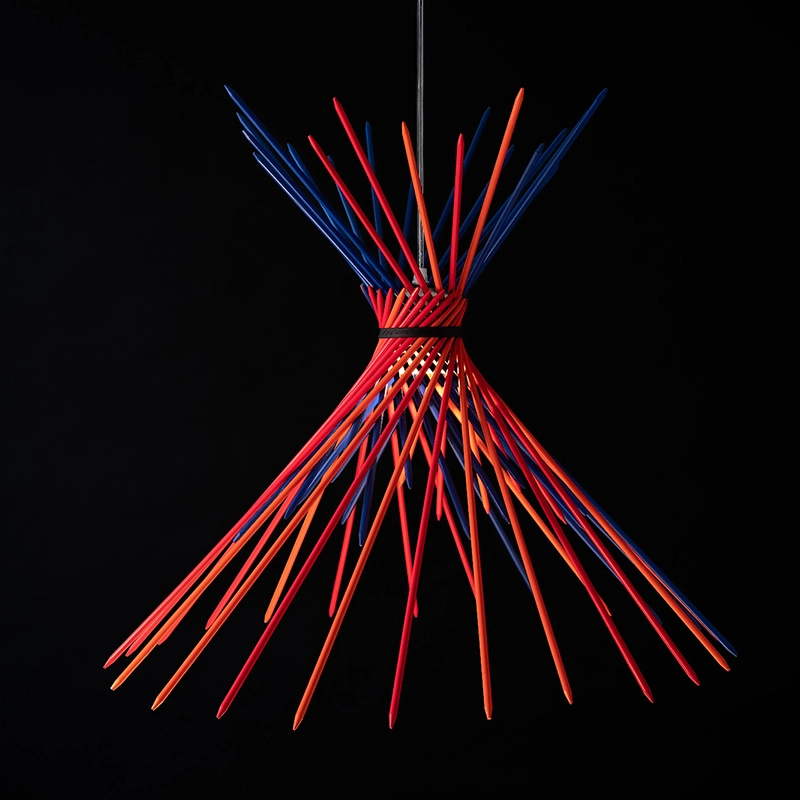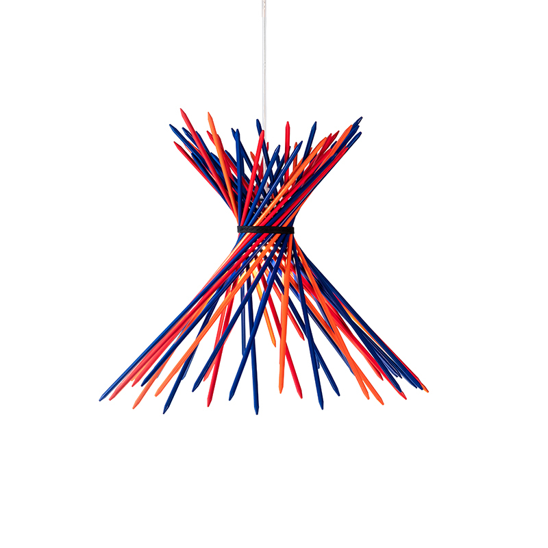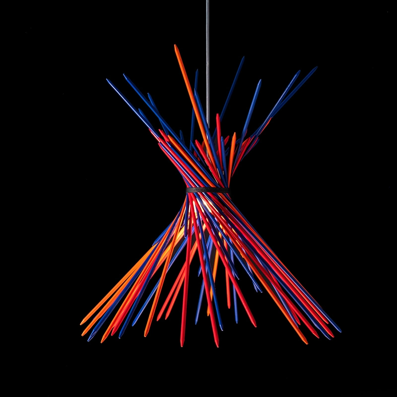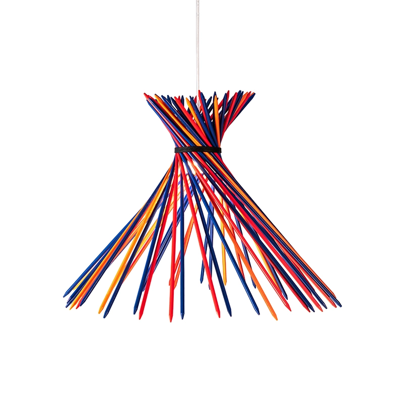 La suspension Pic-a-stic d’Andreas Walther pour Ingo Maurer est une suspension originale et ludique. Inspirée du jeu d'adresse Mikado, elle se compose de longues tiges en bois laqué, disposées autour du corps lumineux et maintenues par un anneau en caoutchouc noir flexible. La position des tiges peut ainsi être modifiée à tout moment. Le luminaire est disponible en kit, ce qui permet à chaque propriétaire de créer lui-même un objet lumineux individuel en quelques gestes. Le suspension Pic-a-stic est disponible en deux versions : une version avec des baguettes noires, blanches et rouges et une version colorée avec des baguettes bleues, rouges et oranges. Editée par Ingo Maurer, la suspension Pic-a-Stic allie de manière originale espièglerie et poésie dans un luminaire unique.
