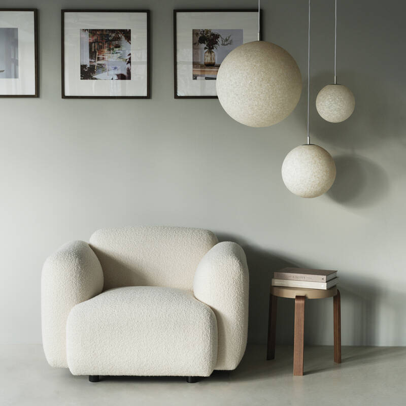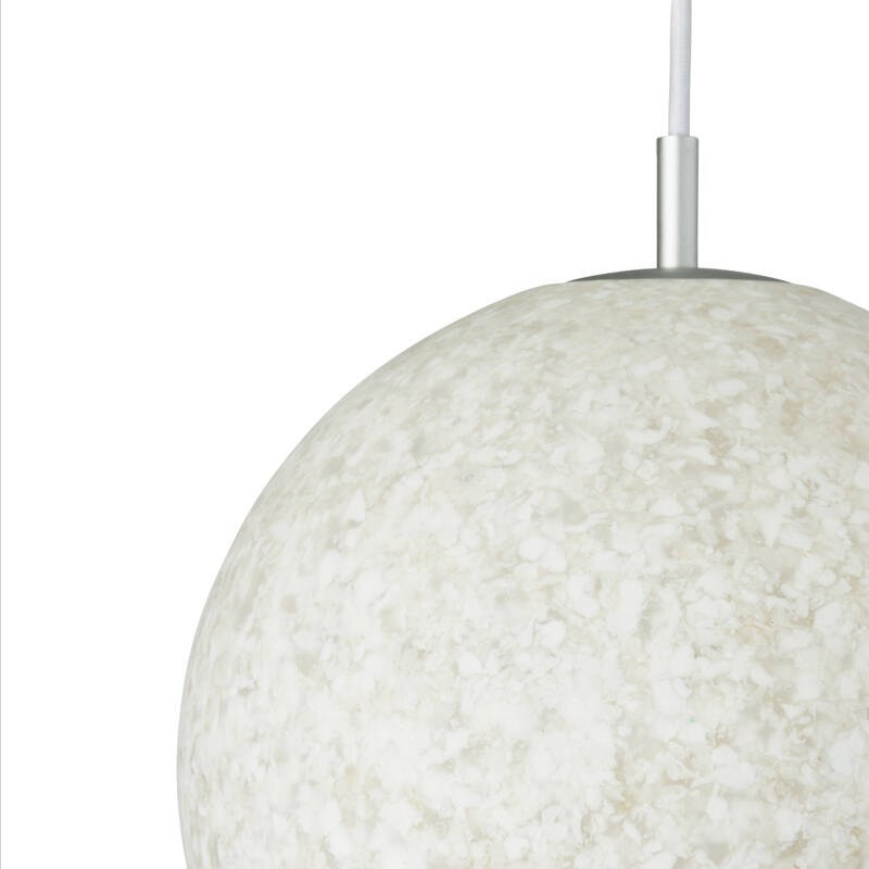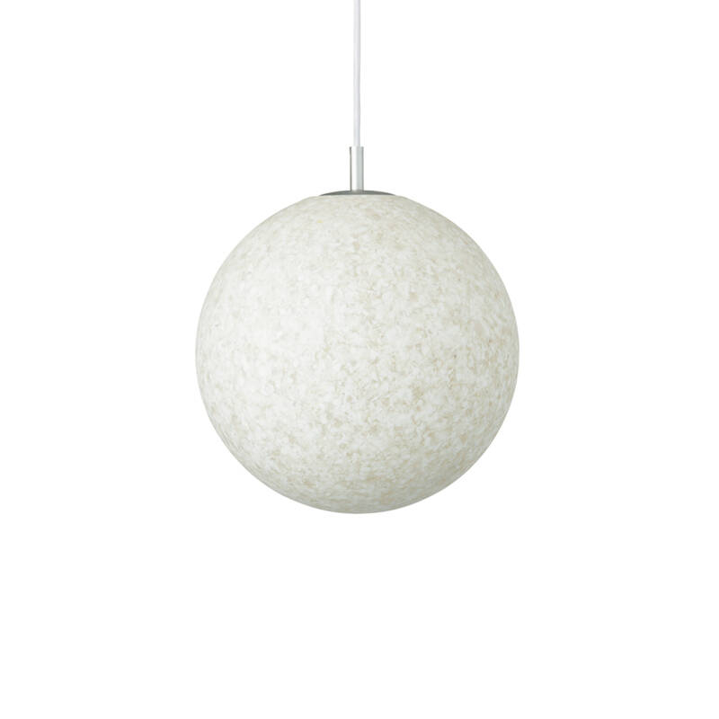 La suspension Pix n'est pas seulement un luminaire esthétique, c'est aussi un design ingénieux. Pour la fabrication de l'abat-jour, des déchets plastiques de différentes nuances de blanc sont mélangés et granulés, avant d'être chauffés à un point de fusion de 120°, permettant au matériau d'être réchauffé et réutilisé en fin de vie sans altérer ses propriétés. L'épaisseur du matériau donne à la Pix un aspect opaque lorsque la lumière est éteinte. Lorsque la lumière est allumée, l'apparence du matériau se transforme, obtenant un aspect translucide, la lumière de l'ampoule traversant et mettant en valeur la structure granulée de l'abat-jour. Quel que soit l'endroit où elle se trouve, la suspension Pix Normann Copenhagen se fondra à coup sûr dans l'intérieur environnant, tandis que son abat-jour distinctif offre une lueur chaleureuse et charismatique.