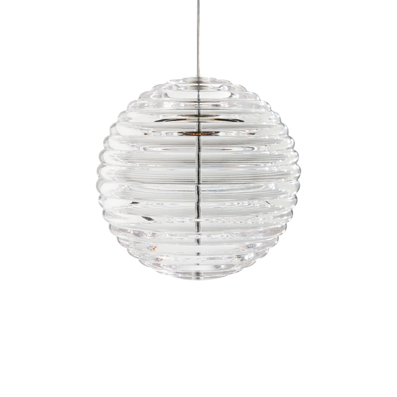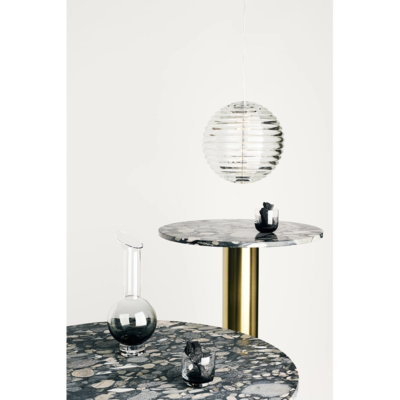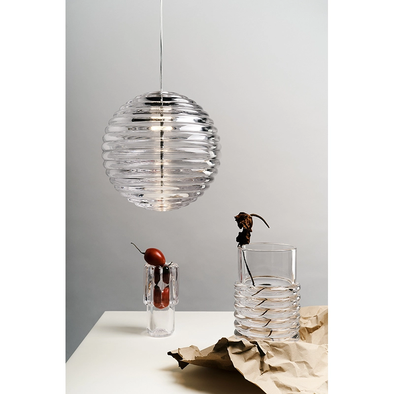 suspension Press Sphere présente une surface striée joliment arrondie. Le verre nervuré permet une diffusion harmonieuse de la lumière, créant ainsi des motifs linéaires et rayés captivants. Cette