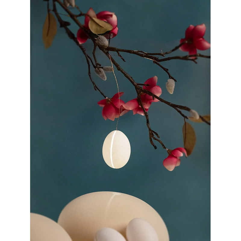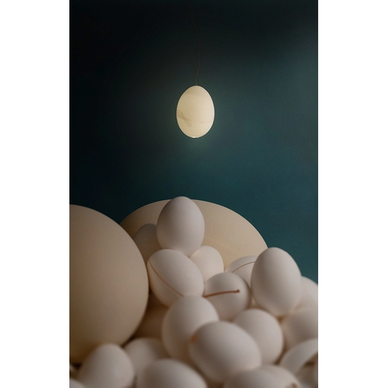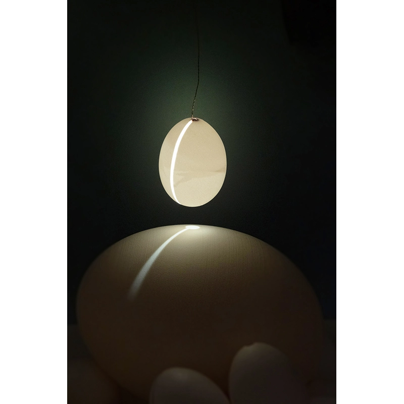 Fabriquée a partir d'une vraie coquille d'œuf, Reality est une lampe délicate, fragile et efficace, dessinée par Theo Möller pour Ingo Maurer. La suspension Reality est réalisée à partir d’un véritable œuf certifié bio, dans lequel est découpée minutieusement une fine fente géométrique. Suspendue par des câbles en cuivre, la LED offre un éclairage doux avec tout juste neuf lumens. C'est dans cette discrétion que réside la véritable beauté de la lampe Reality Ingo Maurer. Reality est livré dans un carton sécurisé avec trois aiguilles en cuivre et le câble de suspension avec connexion USB.