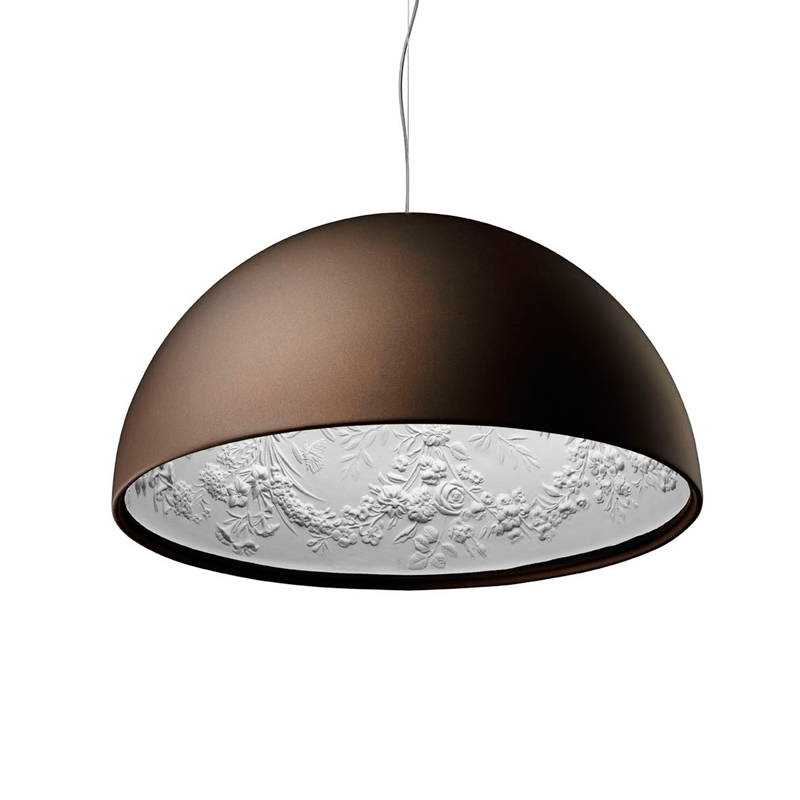 Sky Garden, luminaire dessiné par Marcel Wanders, est une suspension étonnante et poétique éditée par Flos. La lumière se diffuse sous une coupole en plâtre coulé, verni en blanc à l'intérieur et d'une couleur bronze à l'extérieur. Le diffuseur en verre opalin émet une lumière douce et éclaire les motifs végétaux à l'intérieur de la coupole. Marcel Wanders crée une belle alliance entre des décors en bas-reliefs baroques et un extérieur épuré extrêmement contemporain avec Sky Garden. Il nous amène à lever les yeux vers la coupole pour parcourir du regard ce jardin céleste suspendu dans le salon.