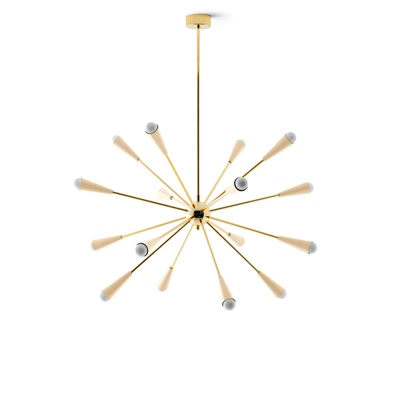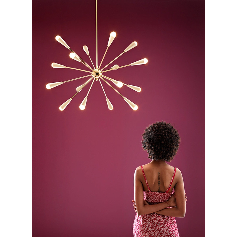 Sculpturale, la suspension Sputnik s'étend dans toutes les directions dans une explosion de lumière, un feu d'artifice qui illuminera parfaitement vos pièces de vie ! La structure de cette suspension signée Stilnovo en 1957 possède seize bras en laiton précieux avec dorure galvanique combinés avec des embouts disponibles en noir, ivoire ou dans la variante multicolore vibrante et joyeuse. Avec ses dimensions généreuses et sa forte personnalité, la suspension Sputnik est idéale pour des grandes pièces de vie où elle sera parfaitement mise en valeur.