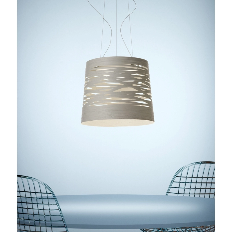 Création de Marc Sadler, cette suspension est réalisée en matériau composite sur une base de fibre de verre laqué. Edité par Foscarini, ce luminaire est réalisé par un entrelacement irrégulier de rubans et de résine, devenant une structure, décoration et protection, créant un jeu jamais vu de pleins et de vides, d'ombres et de lumières. Le fil incrusté dans l'entrelacement de la structure offre un effet esthétique pur et raffiné. Disponible en noir ou en blanc, Tress existe aussi en version lampadaire.