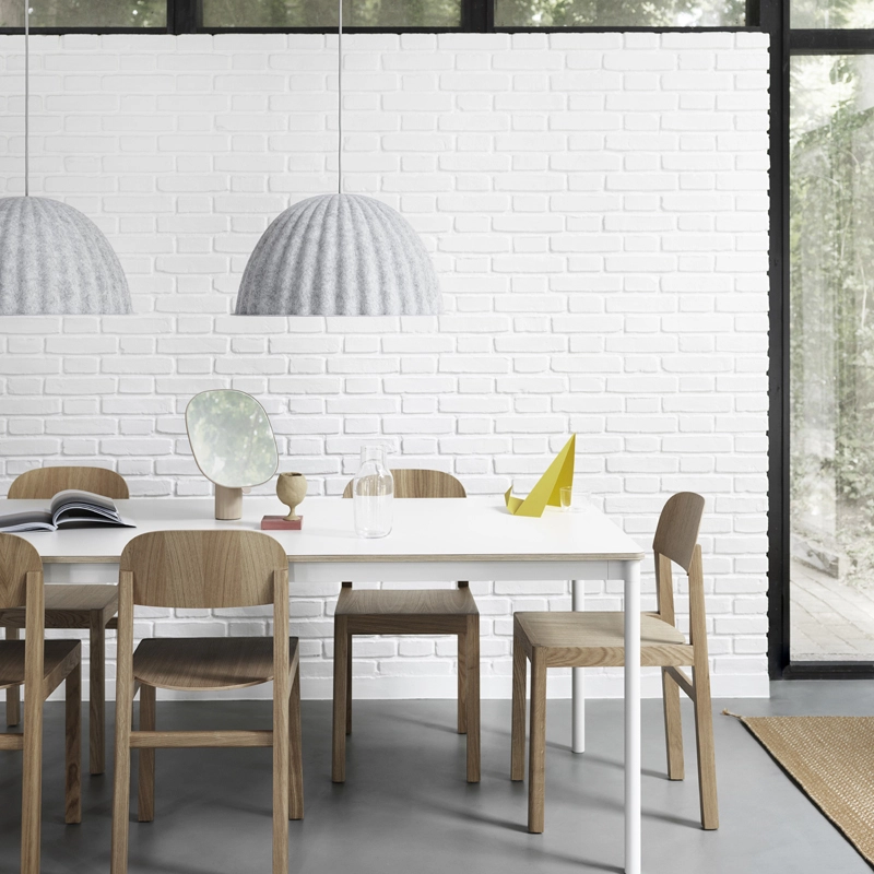 Under The Bell ? « sous la cloche », est une suspension aux dimensions imposantes, dessinée par Iskos Berlin pour l'éditeur Muuto. Ce luminaire design fonctionne aussi bien proche du plafond pour éclairer largement la pièce, ou positionné plus bas au-dessus d'une table. Le feutre de PET moulé qui constitue l'abat jour permet d'améliorer également l'acoustique de la pièce. Avec cette version en diamètre 55, la suspension Under The Bell s'intègre facilement dans des espaces plus petits, que ce soit à la maison ou dans un environnement professionnel.