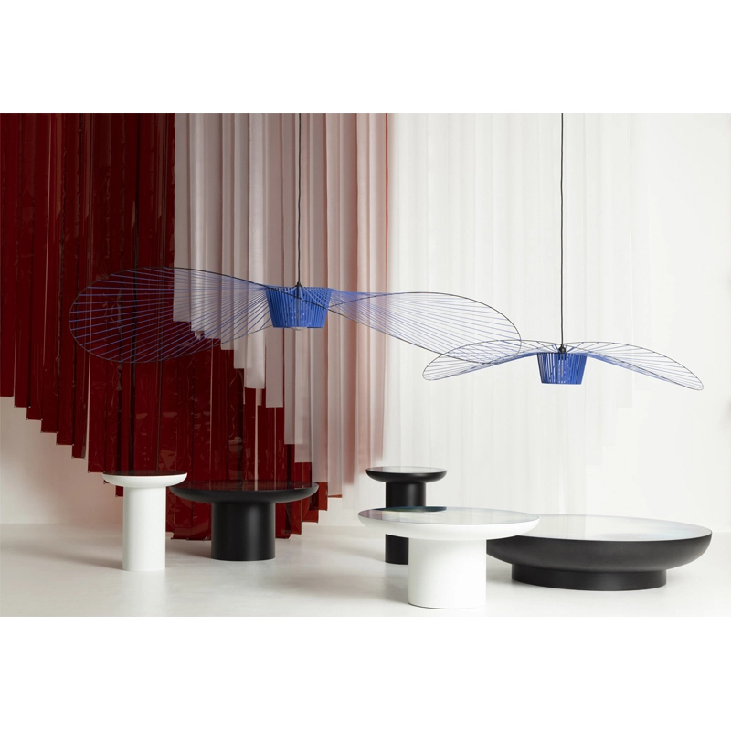 Dessinée par Constance Guisset pour Petite Friturela suspension Vertigo représente un incontournable du design d'aujourd'hui. En effet, Vertigo fut reconnu très tôt par Rossana Orlandi et a ainsi intégré de nombreuses collections permanentes prestigieuses telles que celle du MoMA, du Cap et du MAD. Ce luminaire design a également connu un enthousiasme rapide auprès du public. La suspension Vertigo est disponible en plusieurs tailles et couleurs, ce qui la rend adaptable à tous les intérieurs. Elle peut être utilisée comme éclairage principal ou comme élément décoratif. Vertigo est une véritable sculpture lumineuse graphique qui joue sur les ombres portées et dessine un espace graphique comme suspendu entre le sol et le plafond. Cette suspension très légère se meut au rythme des courants d'air. La suspension Vertigo de Petite friture est une « lampe-cabane » enveloppante qui suggère un espace d'intimité. Allumée, la lampe projette un motif ombré sur les murs environnants et apporte une atmosphère chaleureuse et poétique aussi bien dans la chambre qu'au-dessus de la table de la cuisine. Modulable en hauteur, la lampe Vertigo se fond naturellement dans son environnement, et s’adapte à différentes configurations. Une fois allumée, la suspension Vertigo magnifie la lumière et projette un joli motif ombré sur les murs de la pièce. Sa disposition permet un éclairage à la fois diffus et intense. La suspension Vertigo est une icône de Petite Friture, qui combine fer, fibre de verre et des rubans posés à la main en polyuréthane. Cette émulsion des matériaux permet un véritable travail sur la forme, le volume, la matière…  Vertigo habille les grands espaces par sa présence singulière et onirique. L’esthétique de cette suspension fait écho aux caractéristiques de la maison Petite Friture : graphisme, détail et finition.