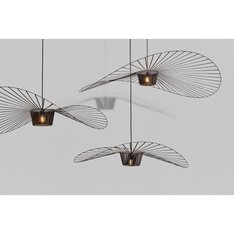 Dessinée par Constance Guisset pour Petite Friturela suspension Vertigo représente un incontournable du design d'aujourd'hui. En effet, Vertigo fut reconnu très tôt par Rossana Orlandi et a ainsi intégré de nombreuses collections permanentes prestigieuses telles que celle du MoMA, du Cap et du MAD. Ce luminaire design a également connu un enthousiasme rapide auprès du public. La suspension Vertigo est disponible en plusieurs tailles et couleurs, ce qui la rend adaptable à tous les intérieurs. Elle peut être utilisée comme éclairage principal ou comme élément décoratif. Vertigo est une véritable sculpture lumineuse graphique qui joue sur les ombres portées et dessine un espace graphique comme suspendu entre le sol et le plafond. Cette suspension très légère se meut au rythme des courants d'air. La suspension Vertigo de Petite friture est une « lampe-cabane » enveloppante qui suggère un espace d'intimité. Allumée, la lampe projette un motif ombré sur les murs environnants et apporte une atmosphère chaleureuse et poétique aussi bien dans la chambre qu'au-dessus de la table de la cuisine. Modulable en hauteur, la lampe Vertigo se fond naturellement dans son environnement, et s’adapte à différentes configurations. Une fois allumée, la suspension Vertigo magnifie la lumière et projette un joli motif ombré sur les murs de la pièce. Sa disposition permet un éclairage à la fois diffus et intense. La suspension Vertigo est une icône de Petite Friture, qui combine fer, fibre de verre et des rubans posés à la main en polyuréthane. Cette émulsion des matériaux permet un véritable travail sur la forme, le volume, la matière…  Vertigo habille les grands espaces par sa présence singulière et onirique. L’esthétique de cette suspension fait écho aux caractéristiques de la maison Petite Friture : graphisme, détail et finition.