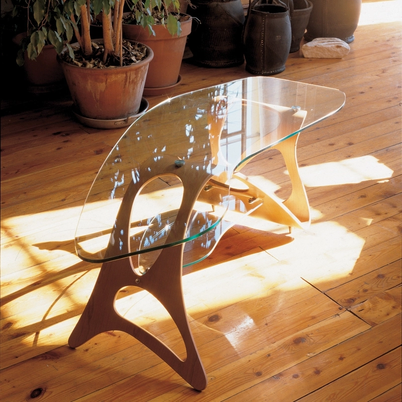 Arabesco est une table basse sculpturale, créée par Carlo Mollino en 1949. Ce classique du design édité par Zanotta joue sur les formes et les matériaux avec une sensation de légèreté, voire de fragilité, bien qu'elle soit très résistante. Arabesco est constituée d'un piètement en contreplaqué de chêne naturel moulé et de deux plateaux en verre trempé. Cette table au design insolite fait partie de la collection de plusieurs grands musées comme le Triennale Design Museum de Milan.