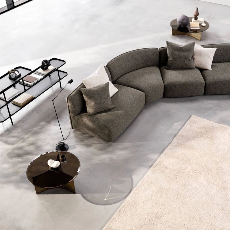 La collection de petites tables Arc se distingue par ses formes géométriques. Le plateau rond en verre fumé laisse voir la base très élégante en acier laitonné. Avec sa silhouette sculpturale et ses finitions raffinées, la table basse Arc de Wendelbo apporte une sensation presque magique dans les intérieurs. Les trois tailles disponibles peuvent être utilisées seules ou en composition de plusieurs éléments.