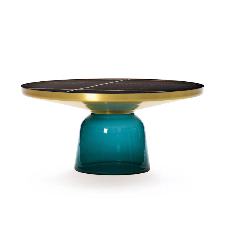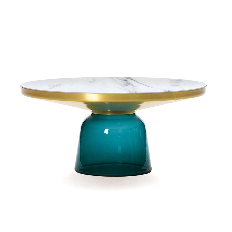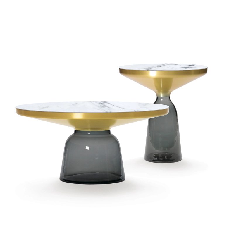 Désormais disponible avec un plateau en marbre, la collection Bell Table de Sebastian Herkner bouleverse l'usage habituel des matériaux en associant le verre, matériau léger et fragile utilisé pour la base, et un plateau réalisé en métal, qui semble flotter au-dessus. Le piétement en verre teinté est soufflé de façon traditionnelle dans un moule en bois. Avec sa présence sculpturale, il contraste avec le cadre en laiton tout en formant une unité harmonieuse rappelant les courbes d'une cloche. Grâce à ses surfaces réfléchissantes et ses matériaux opposés, la Bell Table ajoute une touche raffinée et délicate dans le salon. Elle célèbre la beauté des matériaux avec leurs couleurs et leurs formes, associées aux qualités d'un travail artisanal rigoureux. La table basse design Bell Coffee et la table d'appoint Bell Side sont des pièces uniques et fragiles, chacune étant réalisée intégralement à la main et éditée par Classicon.