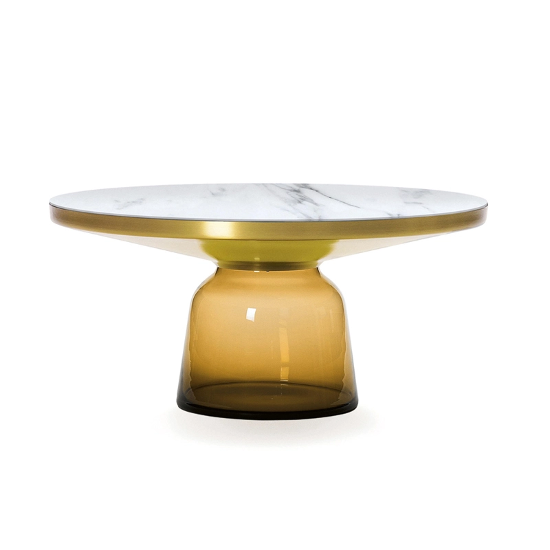 Désormais disponible avec un plateau en marbre, la collection Bell Table de Sebastian Herkner bouleverse l'usage habituel des matériaux en associant le verre, matériau léger et fragile utilisé pour la base, et un plateau réalisé en métal, qui semble flotter au-dessus. Le piétement en verre teinté est soufflé de façon traditionnelle dans un moule en bois. Avec sa présence sculpturale, il contraste avec le cadre en laiton tout en formant une unité harmonieuse rappelant les courbes d'une cloche. Grâce à ses surfaces réfléchissantes et ses matériaux opposés, la