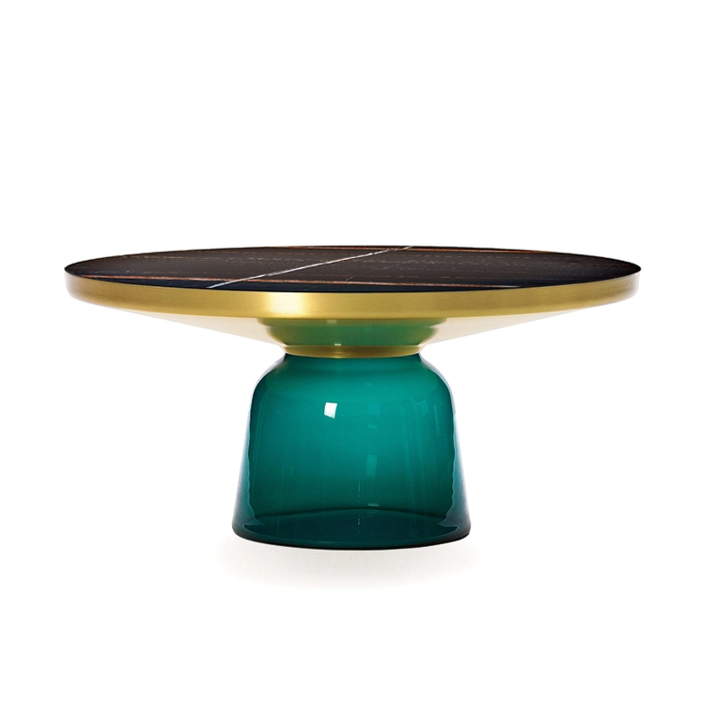 Désormais disponible avec un plateau en marbre, la collection Bell Table de Sebastian Herkner bouleverse l'usage habituel des matériaux en associant le verre, matériau léger et fragile utilisé pour la base, et un plateau réalisé en métal, qui semble flotter au-dessus. Le piétement en verre teinté est soufflé de façon traditionnelle dans un moule en bois. Avec sa présence sculpturale, il contraste avec le cadre en laiton tout en formant une unité harmonieuse rappelant les courbes d'une cloche. Grâce à ses surfaces réfléchissantes et ses matériaux opposés, la Bell Table ajoute une touche raffinée et délicate dans le salon. Elle célèbre la beauté des matériaux avec leurs couleurs et leurs formes, associées aux qualités d'un travail artisanal rigoureux. La table basse design Bell Coffee et la table d'appoint Bell Side sont des pièces uniques et fragiles, chacune étant réalisée intégralement à la main et éditée par Classicon.