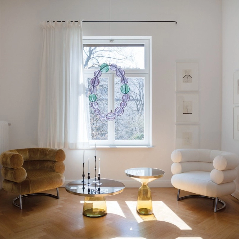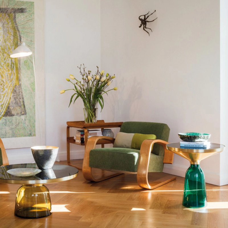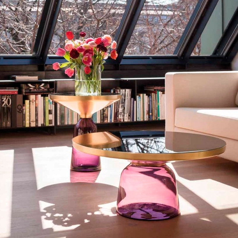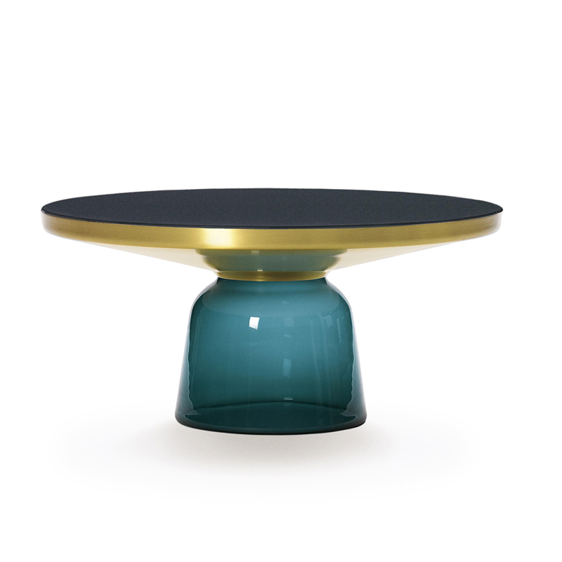 La collection Bell Table de Sebastian Herkner bouleverse l'usage habituel des matériaux en associant le verre, matériau léger et fragile utilisé pour la base, et un plateau réalisé en métal, qui semble flotter au-dessus. Le piétement en verre teinté est soufflé de façon traditionnelle dans un moule en bois. Avec sa présence sculpturale, il contraste avec le cadre en laiton tout en formant une unité harmonieuse rappelant les courbes d'une cloche. Grâce à ses surfaces réfléchissantes et ses matériaux opposés, la Bell Table ajoute une touche raffinée et délicate dans le salon. Elle célèbre la beauté des matériaux avec leurs couleurs et leurs formes, associées aux qualités d'un travail artisanal rigoureux. La table basse Bell Coffee et la table d'appoint Bell Side sont des pièces uniques et fragiles, chacune étant réalisée intégralement à la main et éditée par Classicon.