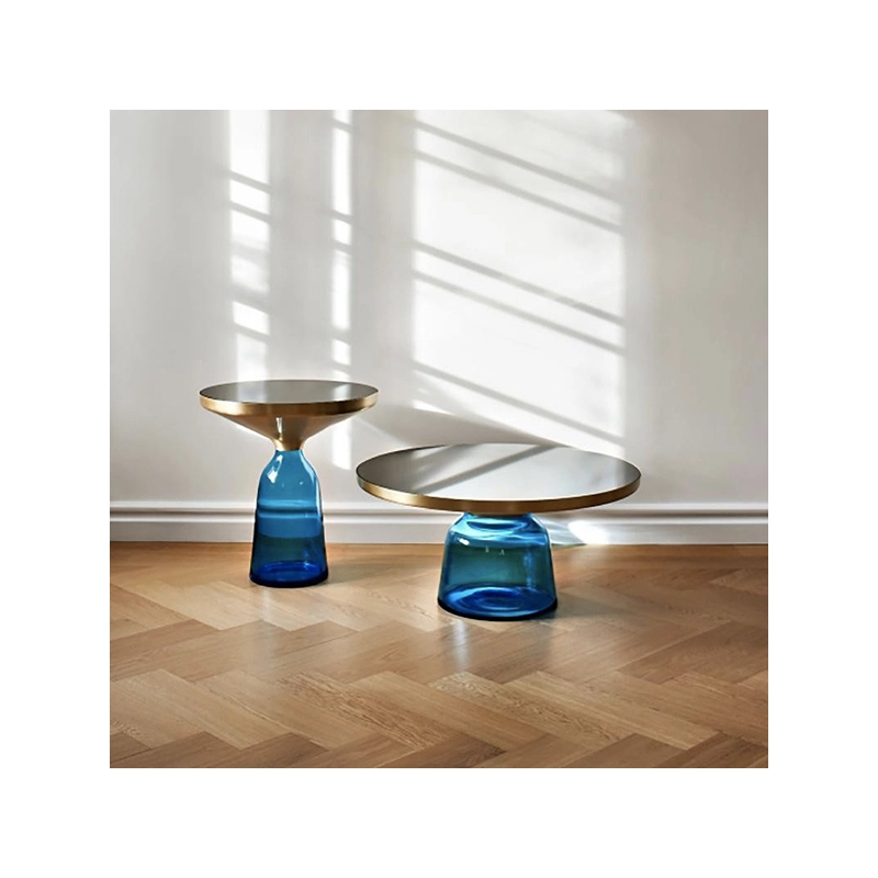 La collection Bell Table de Sebastian Herkner bouleverse l'usage habituel des matériaux en associant le verre, matériau léger et fragile utilisé pour la base, et un plateau réalisé en métal, qui semble flotter au-dessus. Le piétement en verre teinté est soufflé de façon traditionnelle dans un moule en bois. Avec sa présence sculpturale, il contraste avec le cadre en laiton tout en formant une unité harmonieuse rappelant les courbes d'une cloche. Grâce à ses surfaces réfléchissantes et ses matériaux opposés, la Bell Table ajoute une touche raffinée et délicate dans le salon. Elle célèbre la beauté des matériaux avec leurs couleurs et leurs formes, associées aux qualités d'un travail artisanal rigoureux. La table basse Bell Coffee et la table d'appoint Bell Side sont des pièces uniques et fragiles, chacune étant réalisée intégralement à la main et éditée par Classicon.