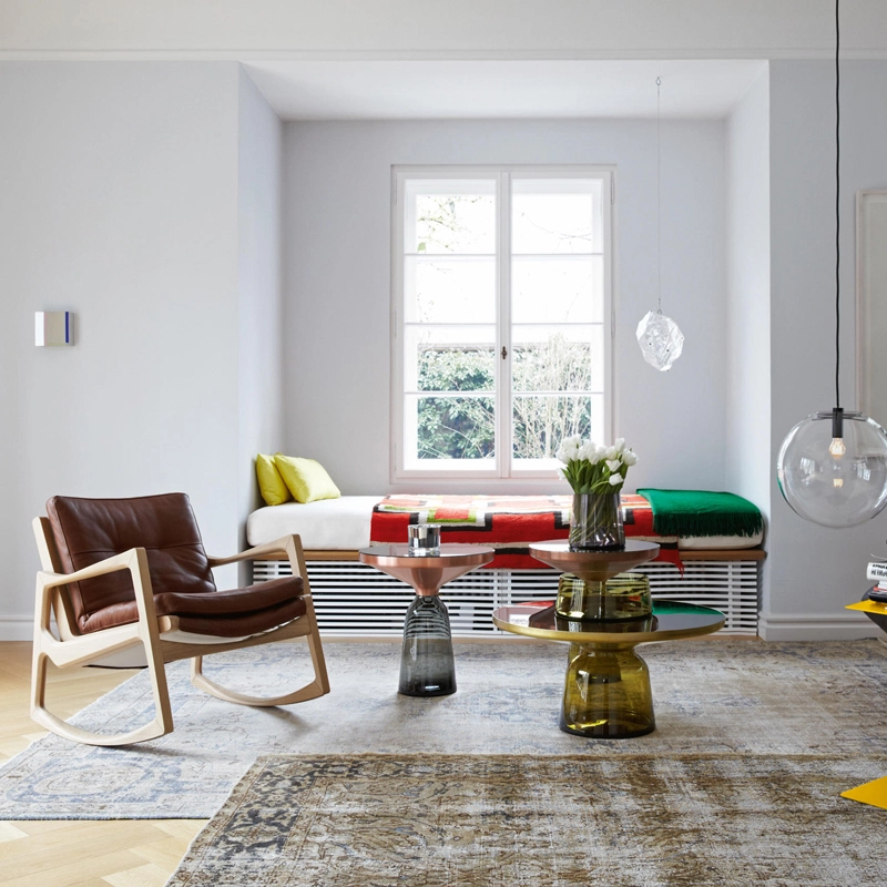 La collection Bell Table de Sebastian Herkner bouleverse l'usage habituel des matériaux en associant le verre, matériau léger et fragile utilisé pour la base, et un plateau réalisé en métal, qui semble flotter au-dessus. Le piétement en verre teinté est soufflé de façon traditionnelle dans un moule en bois. Avec sa présence sculpturale, il contraste avec le cadre en laiton tout en formant une unité harmonieuse rappelant les courbes d'une cloche. Grâce à ses surfaces réfléchissantes et ses matériaux opposés, la Bell Table ajoute une touche raffinée et délicate dans le salon. Elle célèbre la beauté des matériaux avec leurs couleurs et leurs formes, associées aux qualités d'un travail artisanal rigoureux. La table basse Bell Coffee et la table d'appoint Bell Side sont des pièces uniques et fragiles, chacune étant réalisée intégralement à la main et éditée par Classicon.