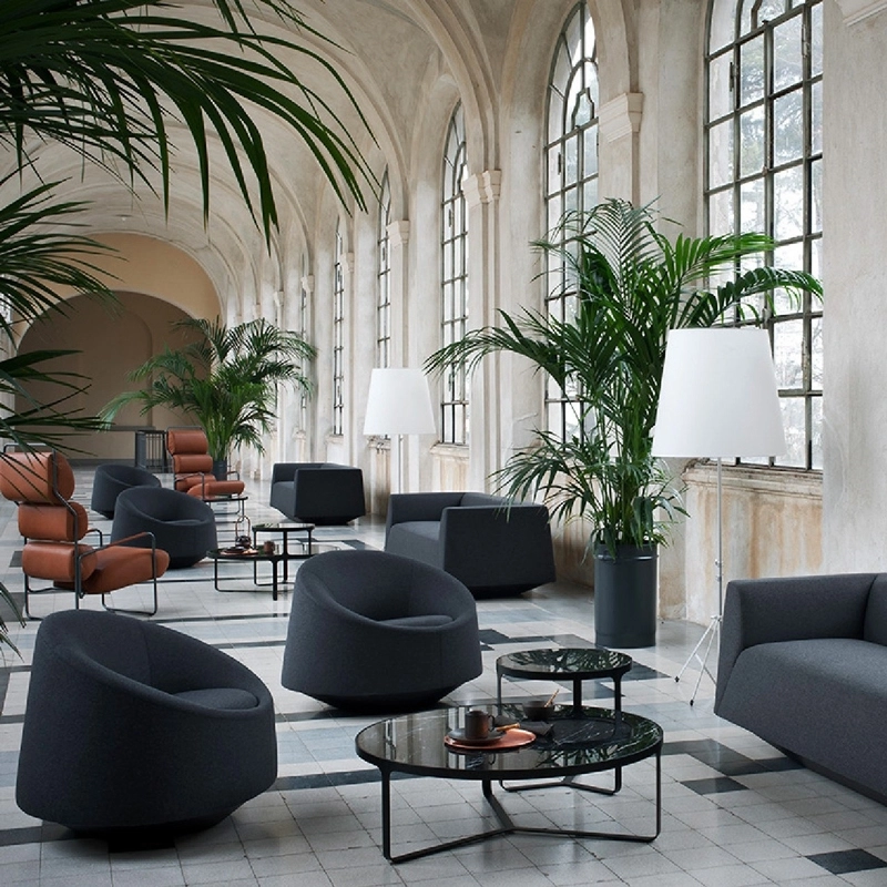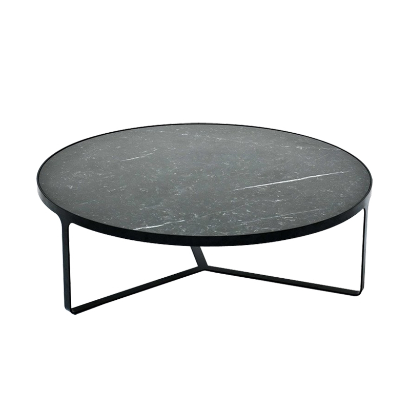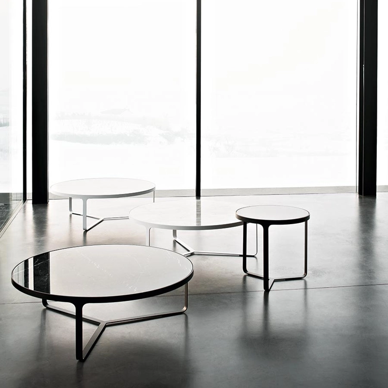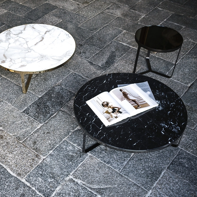 Tacchini, elles sont dotées d’une base en métal qui est à la fois piètement et structure pour le précieux plateau en marbre. Les tables basses et tables d’appoint