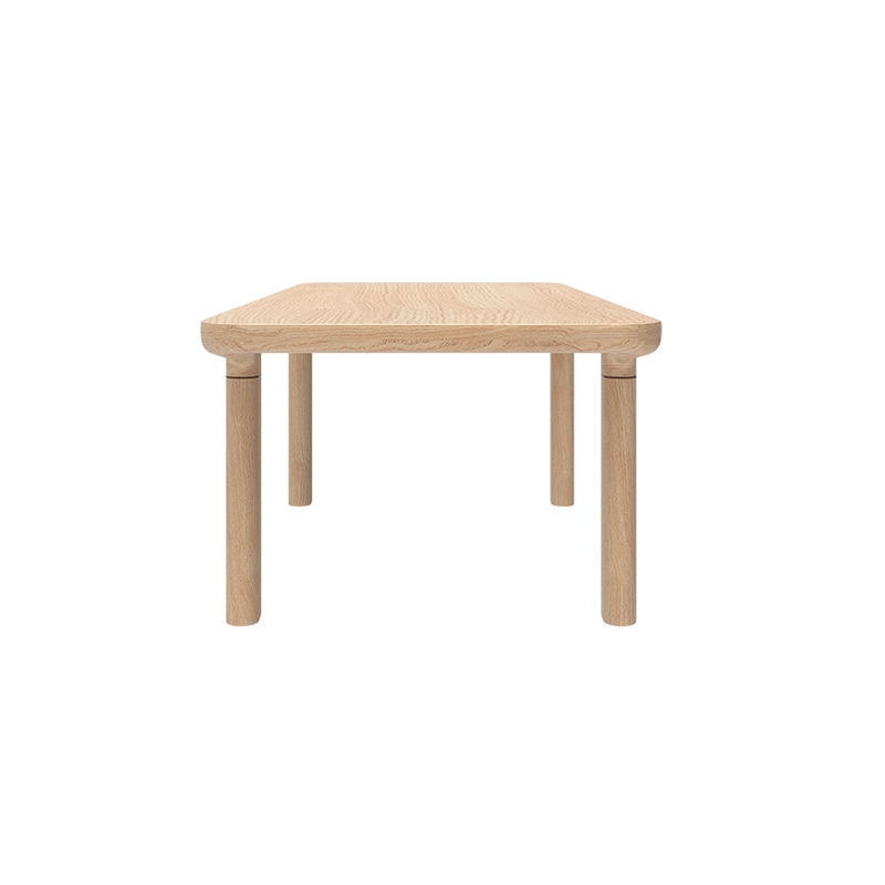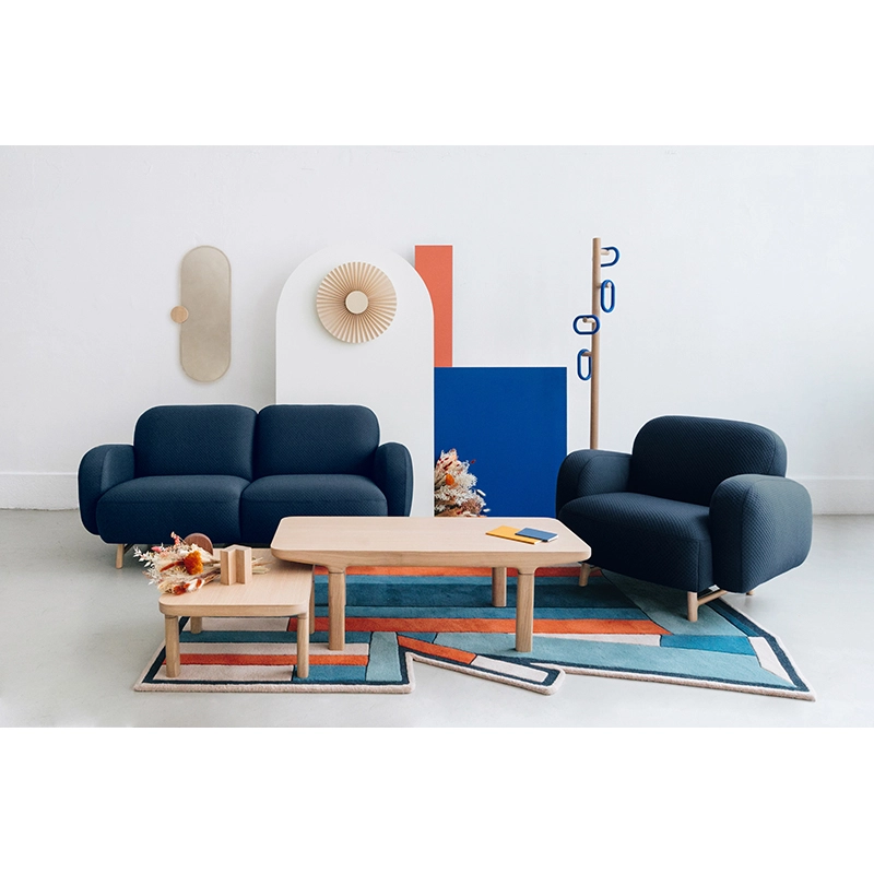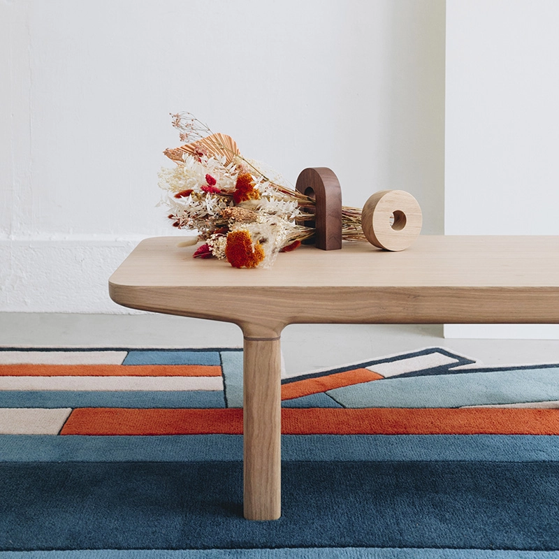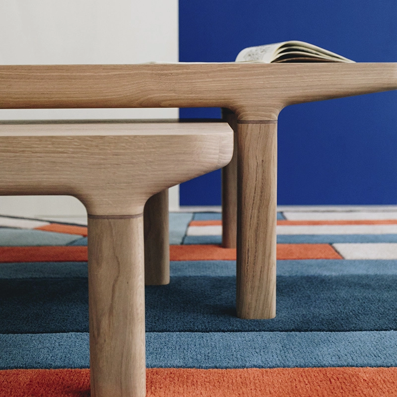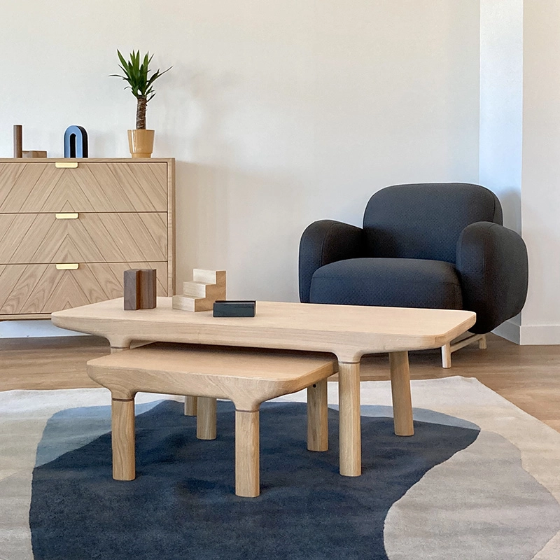 tables basses Camille Harto sont en chêne naturel, et chaque pied est souligné d’une élégante bague en noyer.
