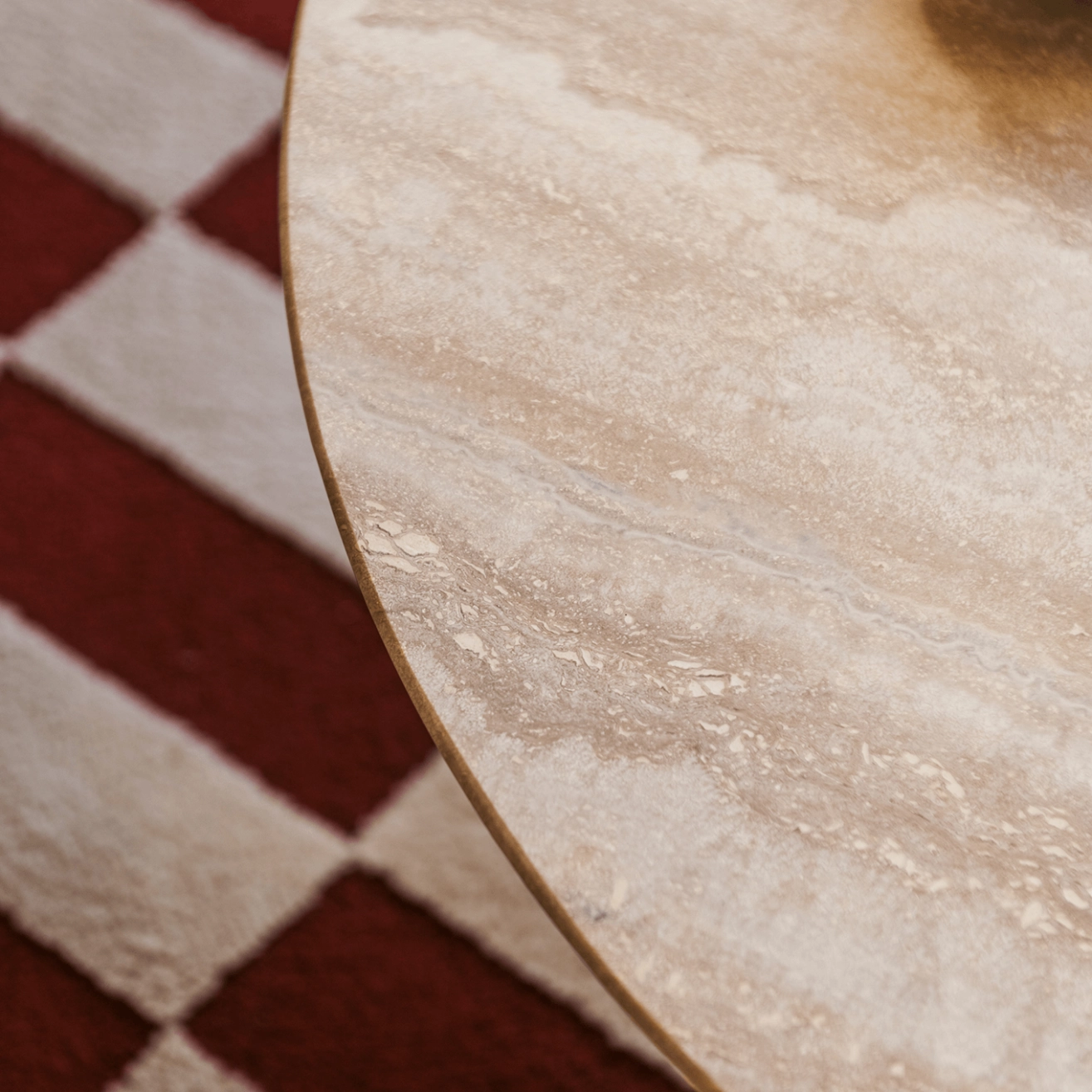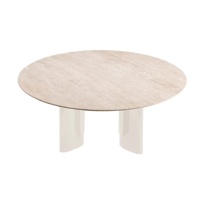 Son piètement élancé, en acier tubulaire blanc crème, confère à la table une allure aérienne et lumineuse. Il soutient un plateau en travertin naturel, pierre emblématique aux nuances beiges et veinures subtiles, qui apporte chaleur et texture à l’ensemble. Chaque plateau, unique par sa matière, révèle la richesse organique et la douceur tactile du travertin.