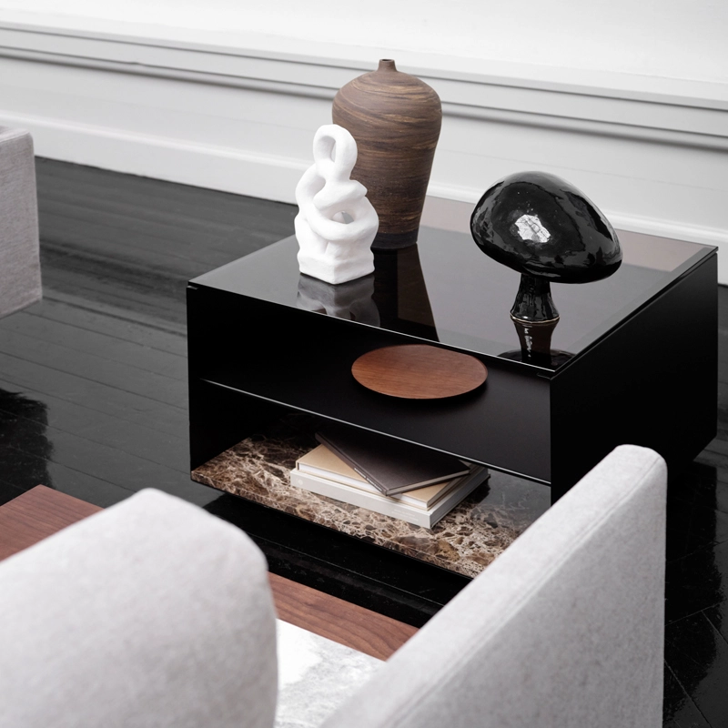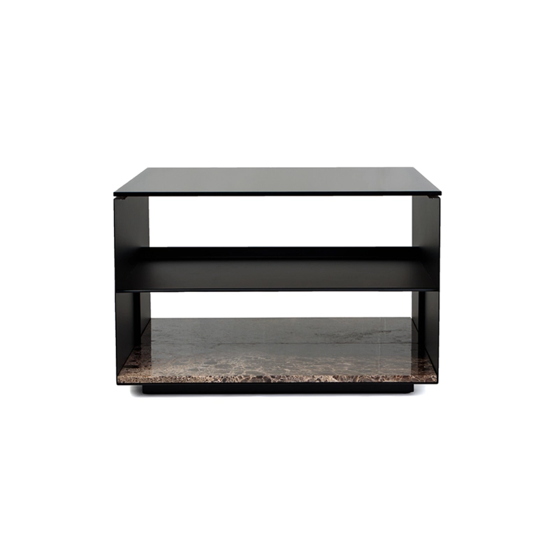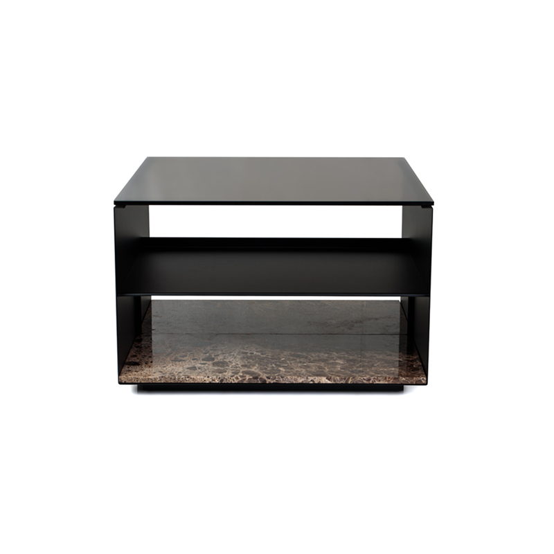 verre fumé, marbre emperador, acier finition époxy noir