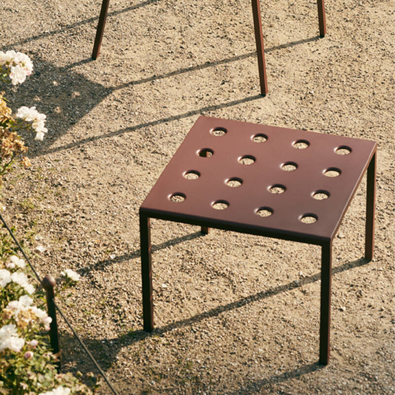 Balcony est une collection de mobilier pour extérieur conçue par les designers Ronan et Erwan Bouroullec pour la marque Hay. Le design carré est adouci par les trous et les bords arrondis, qui donnent non seulement à la collection une expression distinctive, mais aussi renforcent la construction. Toute la collection Balcony est réalisée en acier revêtu de poudre qui reçoit en plus un traitement contre la corrosion. Cette double finition permet une résistance et une durabilité optimale. Déclinée en plusieurs couleurs, la collection de meubles outdoor Balcony est parfaitement adaptée aux balcons, jardins et autres espaces extérieurs. La collection Balcony comprend des chaises et fauteuils empilables, un banc décliné en deux longueurs, une table de repas disponible en trois dimensions et une table basse.