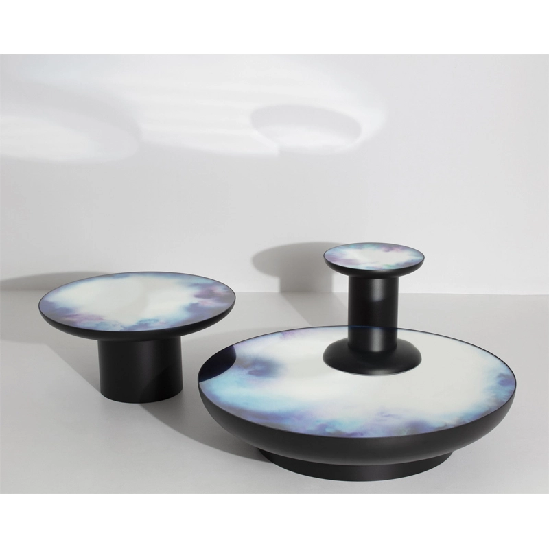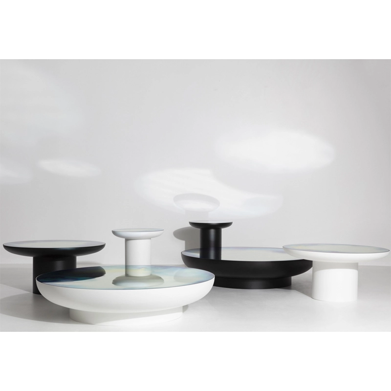 La collection de tables Francis haute propose un nouveau regard sur le miroir créé par Constance Guisset en 2012. Le miroir devient un plateau, et en passant à l'horizontal il renverse la logique du reflet et apporte une touche surprenante et poétique à votre intérieur. L'impression sur le miroir qui caractérise la série Francis est inspirée de la vision de couleurs fuyant du pinceau au contact de l’eau. Le plateau hypnotisant est fixé sur un pied en acier repoussé. Déclinées en trois tailles, les tables éditées par Petite Friture sont parfaite seules ou en composition de plusieurs modèles.
