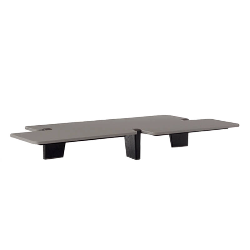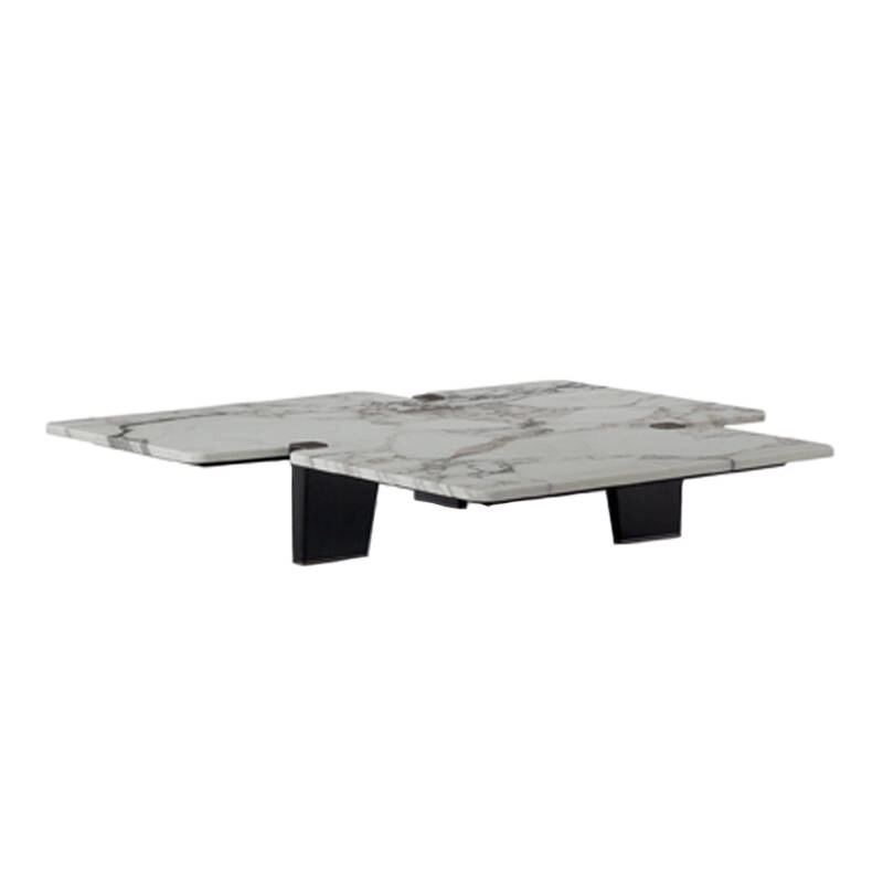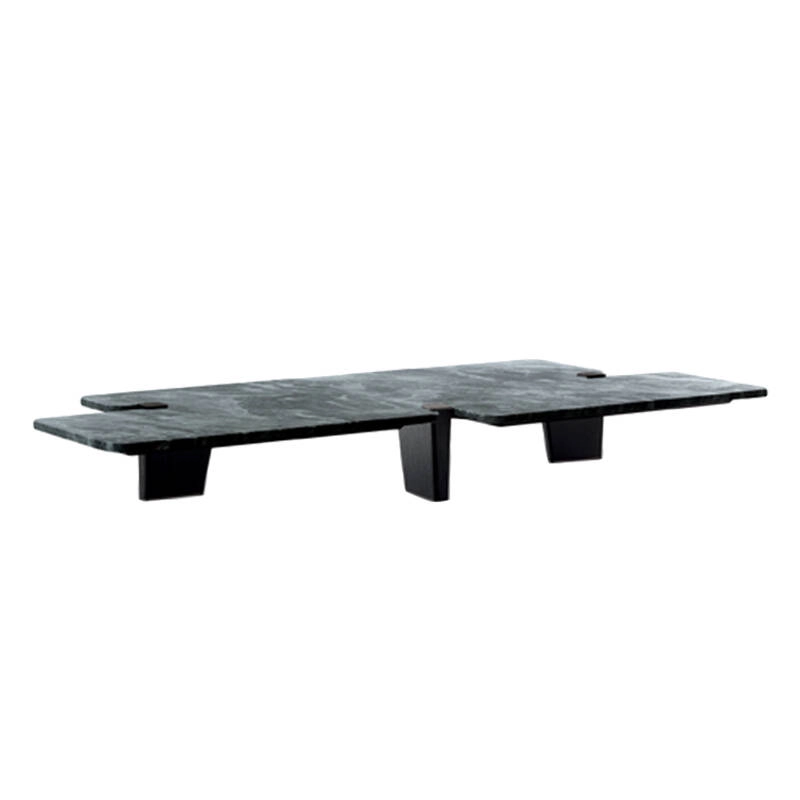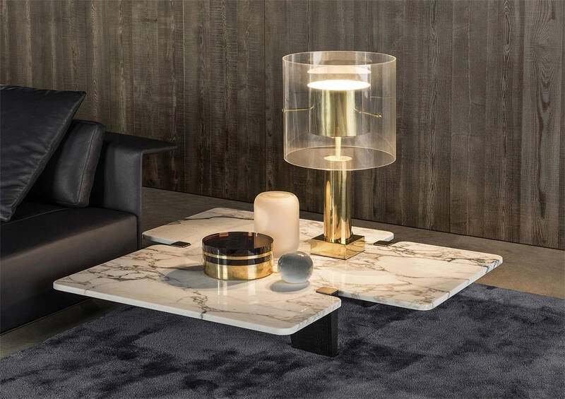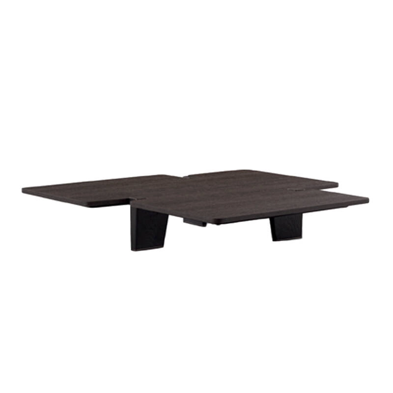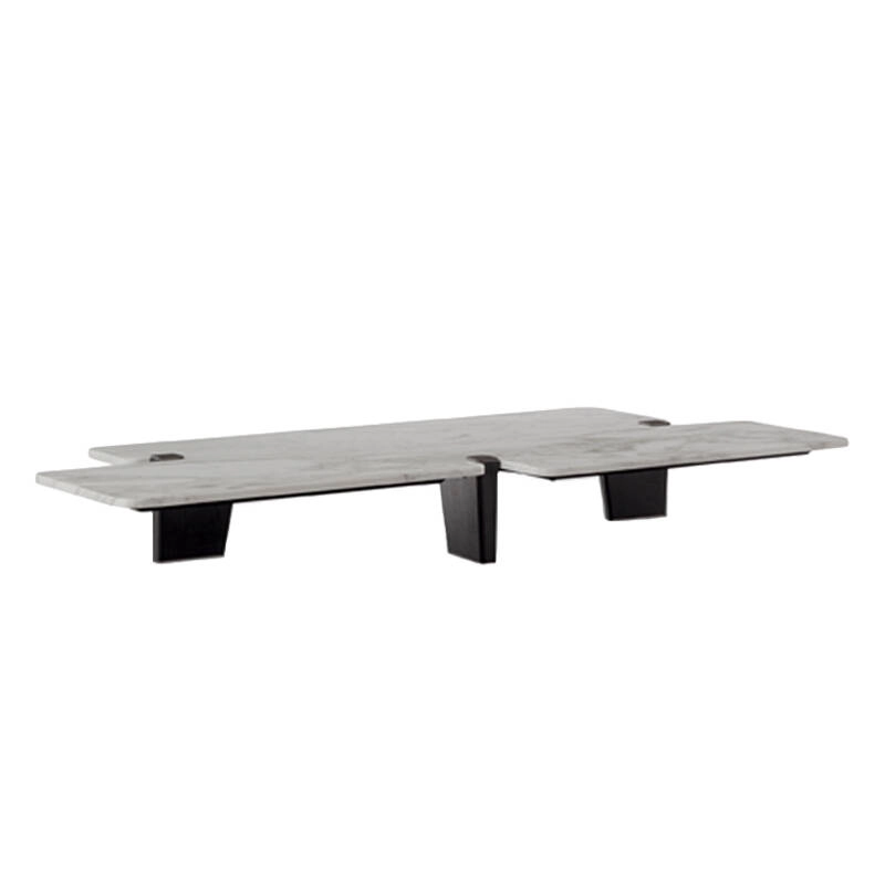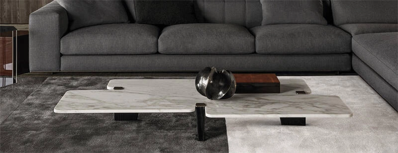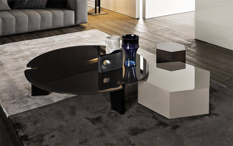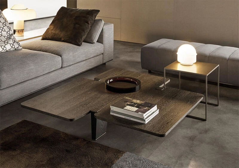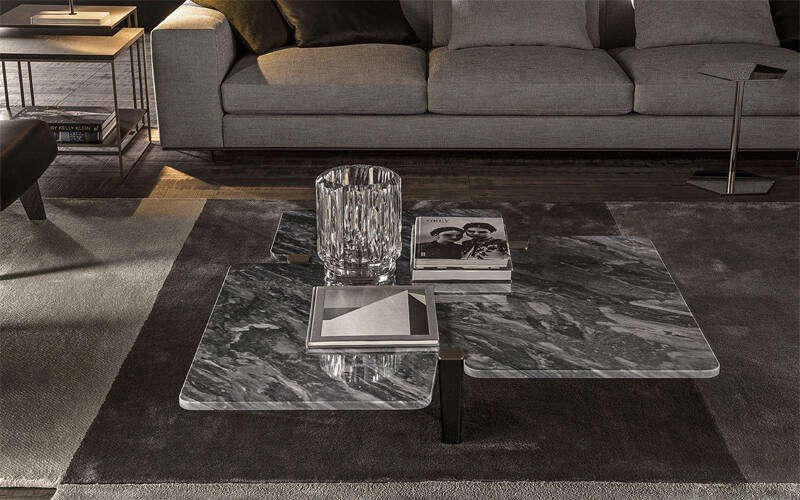 Minotti. Cette série de tables basses est éclectique autant pour son utilisation que pour la variété de finitions et de dimensions. Des plateaux aux formes insolites reposent sur des pieds en chêne massif brossé et peint de couleur noir. L’embout des pieds et la plaque située à l’extrémité supérieure, réalisés en métal bronze, sont autant de détails qui ajoutent une touche d’élégance à ces tables au caractère fort. Les nombreuses finitions disponibles vont du plateau plaqué Sucupira teinté vison, à celui plus recherché du marbre Calacatta ou Bardiglio Nuvolato, en passant par la modernité du laqué brillant dans les couleurs sable et boue. La petite table