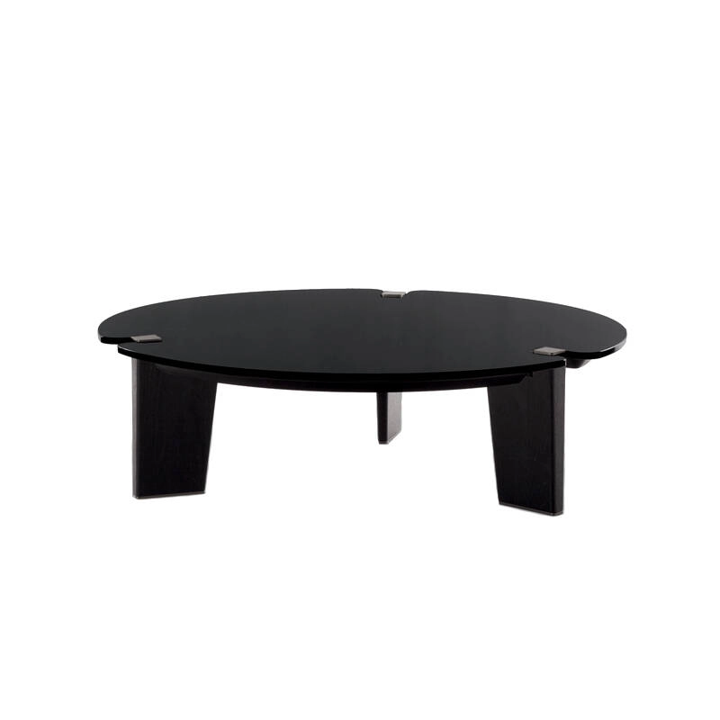 Jacob avec plateau rond est disponible dans les variantes plaqué Sucupira teinté vison et en verre rétro-peint.