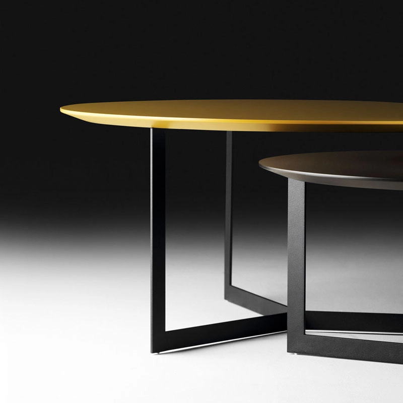 Kabi est graphite. Les plateaux, à bords biseautés, se déclinent en finitions noyer, chêne ou laqués de différents coloris.