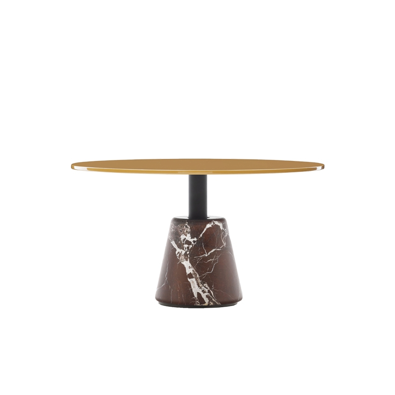 La collection Menhir renvoie sans aucun doute au classicisme grec et aux célèbres monolithes français et britanniques en érigeant une colonne matte – en marbre dans la version d’origine, qui relie l’imposante base en marbre, dite « Rocchio », à son élégant plateau en bois laqué ; ce choix de matériaux provoque un contraste assez saisissant de couleurs et d’éléments, mais aussi un certain effet de stabilité.