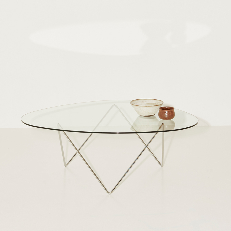 table basse Pedrera est composée d'une base en acier sur laquelle repose un plateau en verre et qui reprend la forme de la base des lampes. La