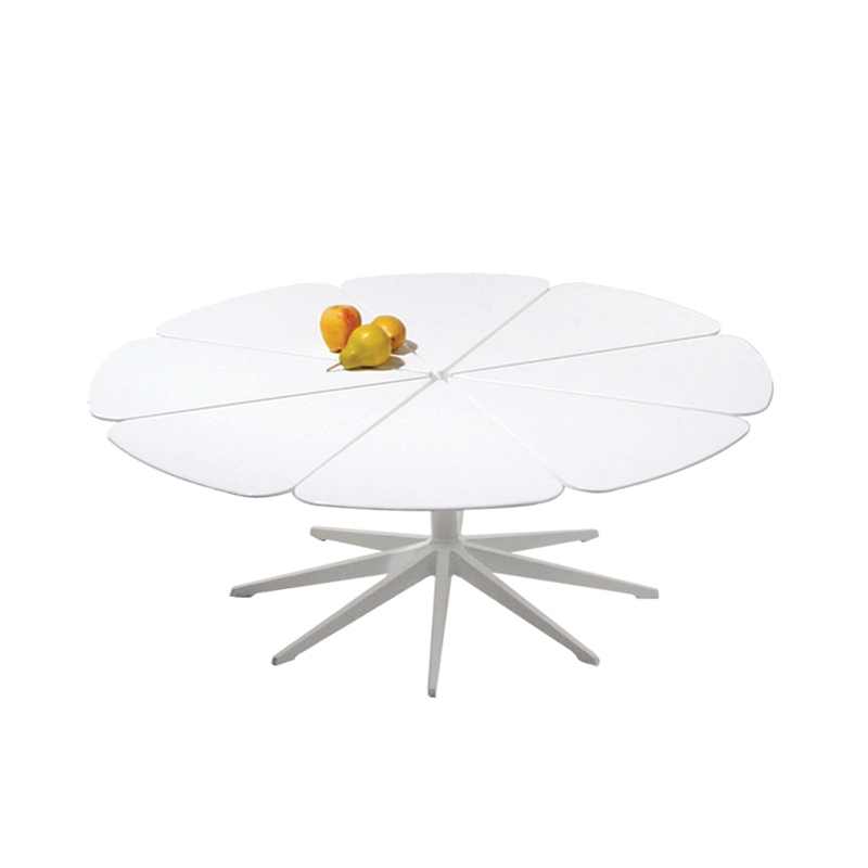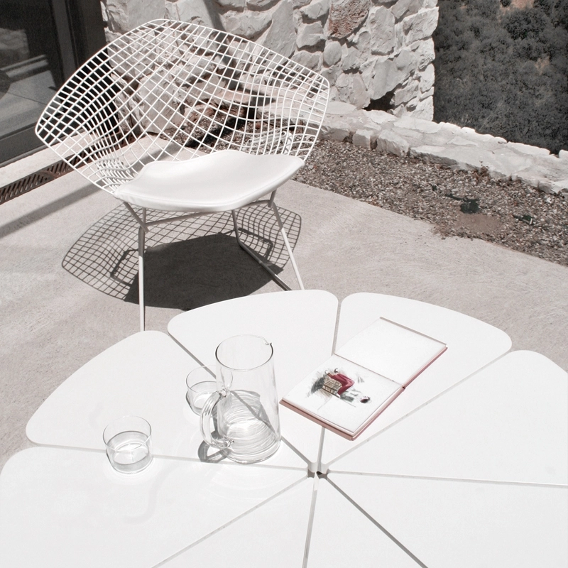 Pour cette série de tables Petal, dessinée en 1960 et éditée par Knoll, Richard Schultz s'est inspiré d'une plante : « la Queen Ann's Lace ». Le plateau est composé de huit pétales en polyuréthane et il est fixé sur une base élégante et graphique à piètement étoilé, réalisé en fonte d'aluminium. Chaque pétale est indépendant des autres, et peut se dilater ou se contracter légèrement en fonction des conditions climatiques, assurant ainsi la stabilité de la table au fil des saisons, pour pouvoir en profiter dans votre jardin dès que le soleil fait son apparition !