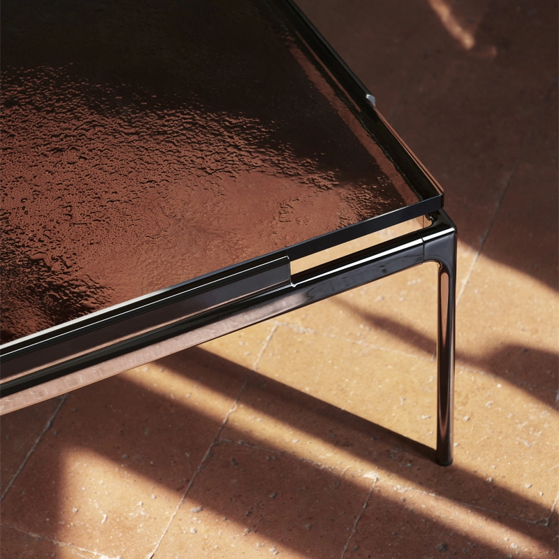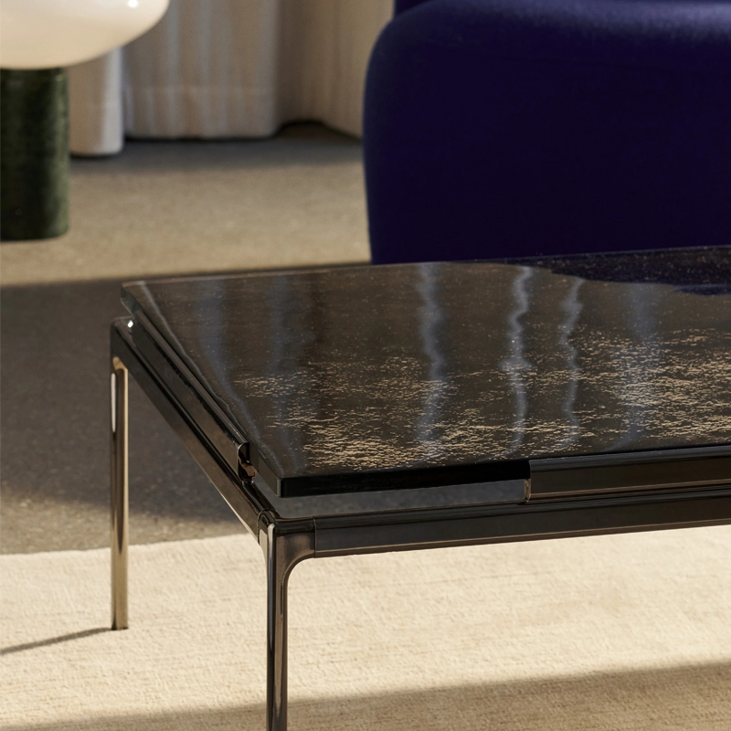 plateau en marbre ou verre coulé, et piètement en aluminium moulé sous pression finition chrome foncé