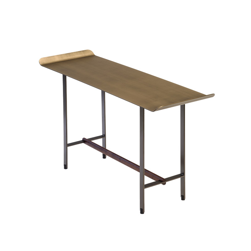 métal laqué, traverse noyer massif, plateau métal patiné bronze