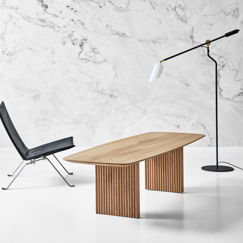 DK3 a été l'une des premières marques à introduire la table en planches sur le marché scandinave en 2009. Dans le but de porter cet héritage de design à un niveau supérieur, le fondateur de DK3, Jacob Plejdrup, a développé le concept de table à manger Ten, en coopération avec le designer danois Christian Troels en 2019. En 2020, le design exclusif a été lancé dans une version table basse. Les créations de Christian Troels se caractérisent par un grand niveau de détails et une précision artisanale qui se fondent parfaitement avec l'idée de conception de base de Jacob Plejdrup : la collection de tables Ten incarnent la beauté naturelle du bois de manière minimaliste, aussi bien dans les versions table à manger que dans les versions table basse. Le plateau et les pieds de Ten sont en bois massif, mais elle réussit à donner une sensation une légèreté, soulignée par les détails artisanaux raffinés comme les belles rainures verticales des pieds et le plateau de table distinctif aux formes organiques. La forme légèrement incurvée du plateau de table ne présente aucune ligne droite et, en combinaison avec le bord incliné de la table, il semble que le plateau bouge constamment, ce qui donne à la table Ten une expression unique.