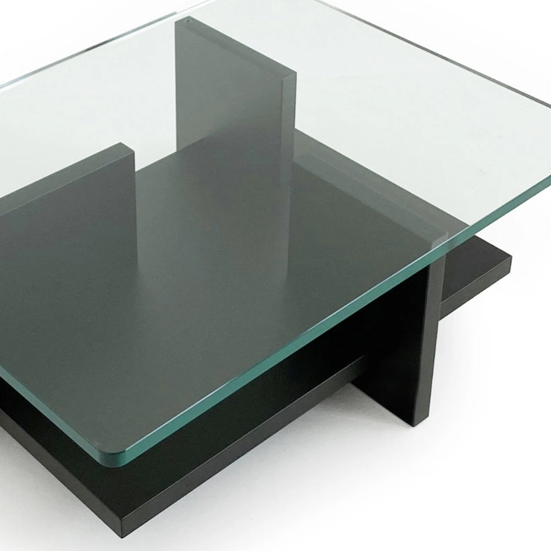 table basse Theo intègre un plateau en verre transparent de 19 mm d'épaisseur, permettant à la lumière de traverser l'espace intérieur.