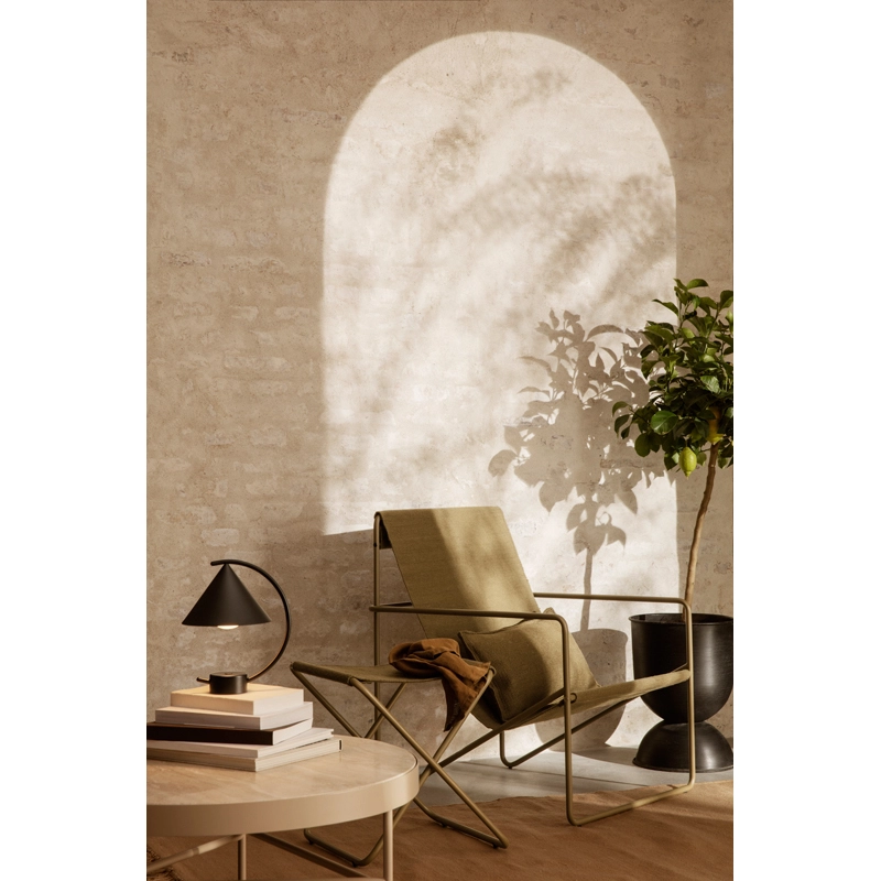 Travertine a été conçue pour la marque Ferm Living par Trine Andersen.  C'est une table basse fonctionnelle et polyvalente. Le plateau possède une texture naturelle et riche de détails. Il contraste magnifiquement avec l'expression industrielle du cadre en métal enduit de poudre. La table Travertine peut être associée à la version medium pour créer une table basse unique et modulable dans le salon.