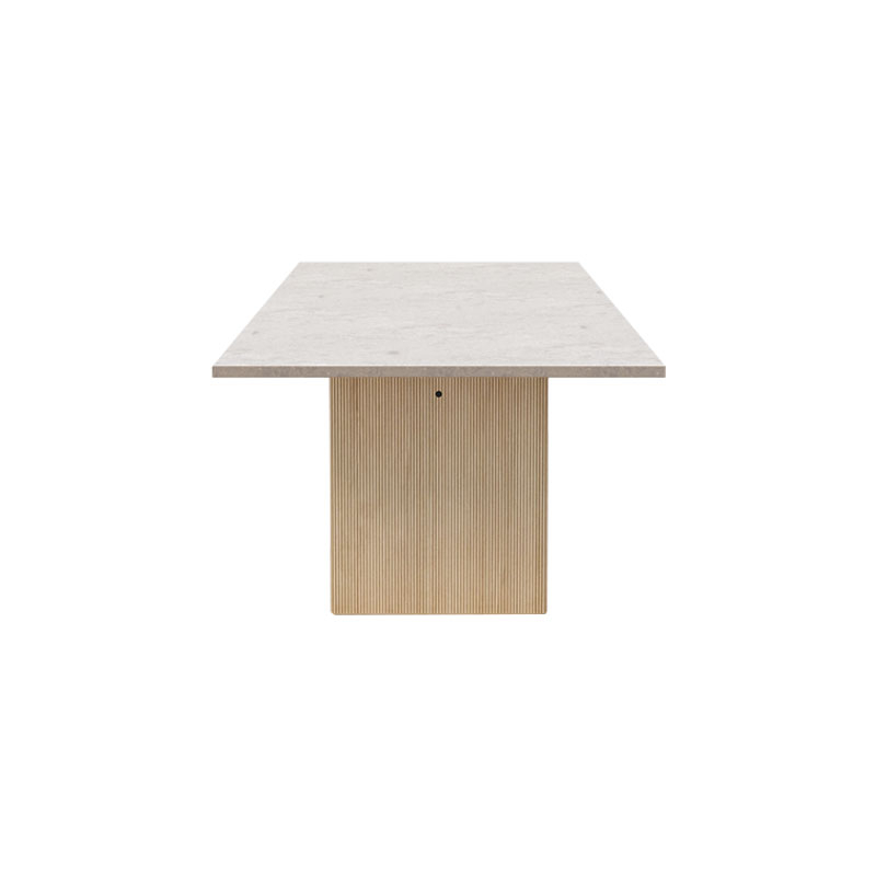 La table Cabin Square de Vipp allie élégance et matériaux naturels dans un design épuré. Pensée pour accueillir huit convives, elle est disponible avec un plateau en marbre Pietra Grey ou en calcaire Jura Grau Blau, deux pierres uniques aux veines et fossiles naturels qui témoignent de millions d’années de formation géologique. Le marbre Pietra Grey offre un fond gris profond parcouru de veines blanches et noires contrastées, tandis que le calcaire Jura Grau Blau se distingue par ses nuances grisées et dorées, enrichies de détails rustiques comme des veines de verre. Le plateau de la table Cabin Square de Vipp repose sur une base en chêne massif, avec des pieds parallèles sculptés de rainures verticales, disponibles en finition claire ou foncée. Conçue pour durer, cette table est protégée par des traitements soignés qui préservent la pierre et le bois. Polyvalente et intemporelle, elle apporte caractère et sophistication aux salles à manger contemporaines.