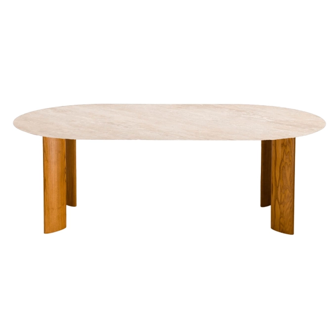 Son piètement en frêne Iroko, travaillé avec soin, dévoile des nuances dorées et des veinures subtiles qui soulignent la noblesse du bois. Il soutient un plateau en travertin naturel, pierre emblématique au ton beige lumineux, marquée de fines cavités et d’irrégularités qui lui confèrent toute sa richesse et son authenticité. Chaque table est unique, façonnée par des artisans européens selon des techniques de haute précision.
