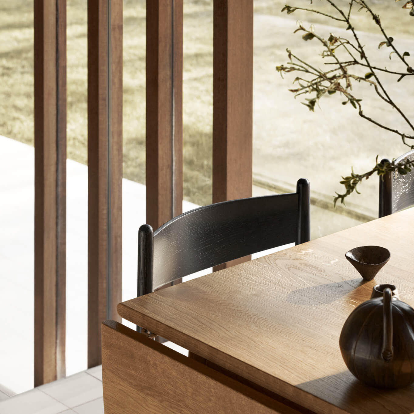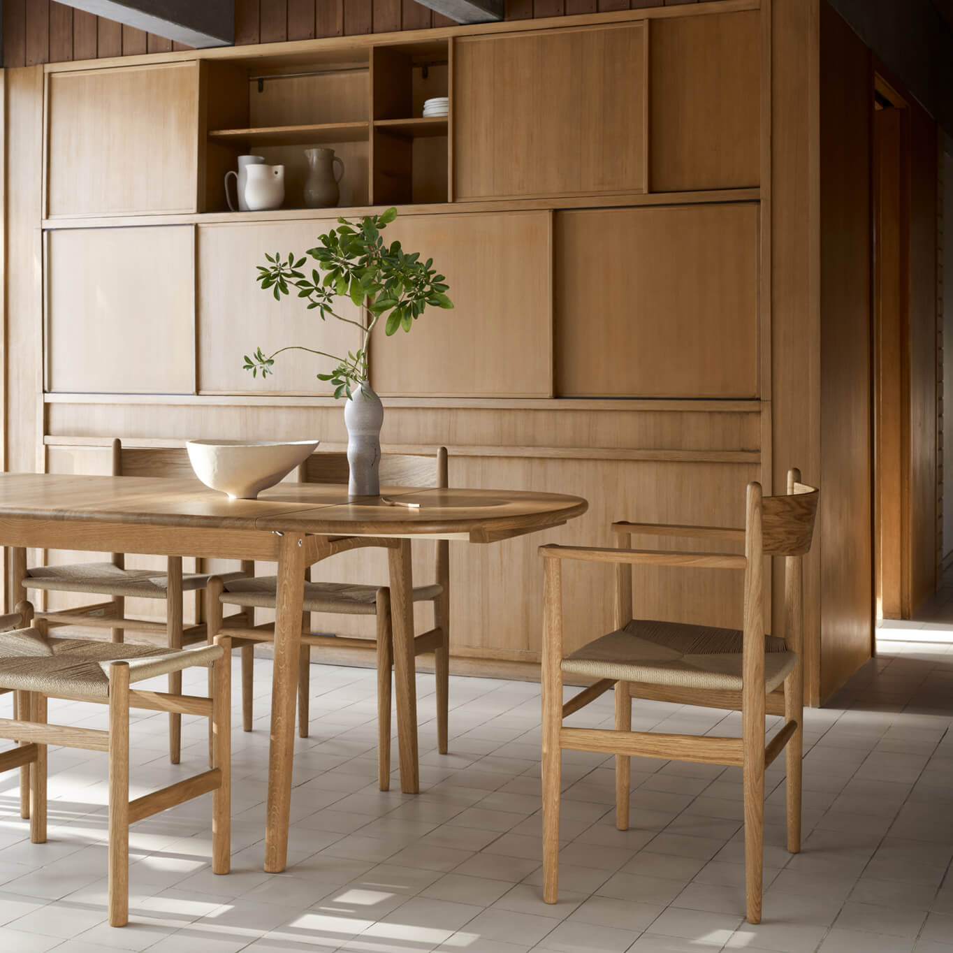 La table de repas CH006, éditée Carl Hansen, met en évidence l'attention exceptionnelle que porte Hans J. Wegner aux détails et à la fonctionnalité. La table CH006 est idéale pour les petites espaces mais aussi pour les environnements plus spacieux, grâce à son design épuré et intelligent. La table est équipée de rallonges rabattables aux deux extrémités qui se soulèvent facilement pour accueillir des invités supplémentaires. Le design en bois massif de hêtre ou de chêne se marie élégamment avec toutes les chaises de salle à manger de Wegner, prenant une expression différente et individuelle selon la chaise, le type de bois et la finition choisie. La table est également disponible dans une édition similaire plus petite sous le numéro de modèle CH002.