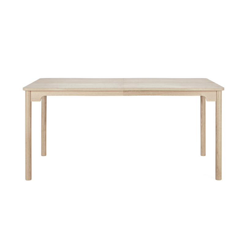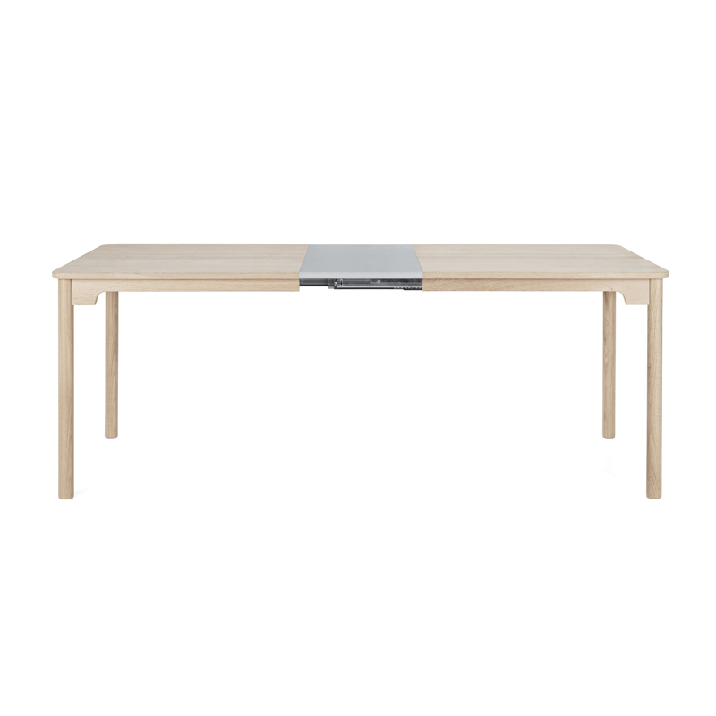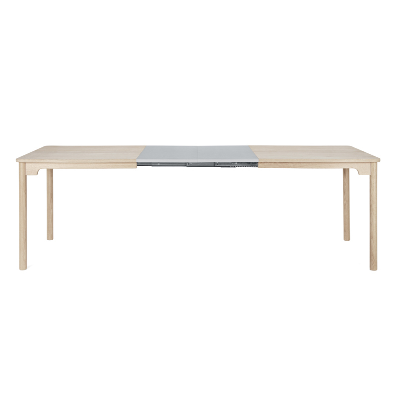 Mater. La table est réalisée en chêne massif FSC et peut être allongée avec une ou deux rallonges amovibles en MDF gris. La table