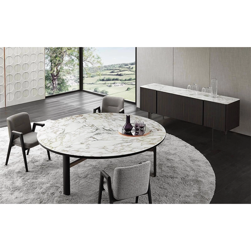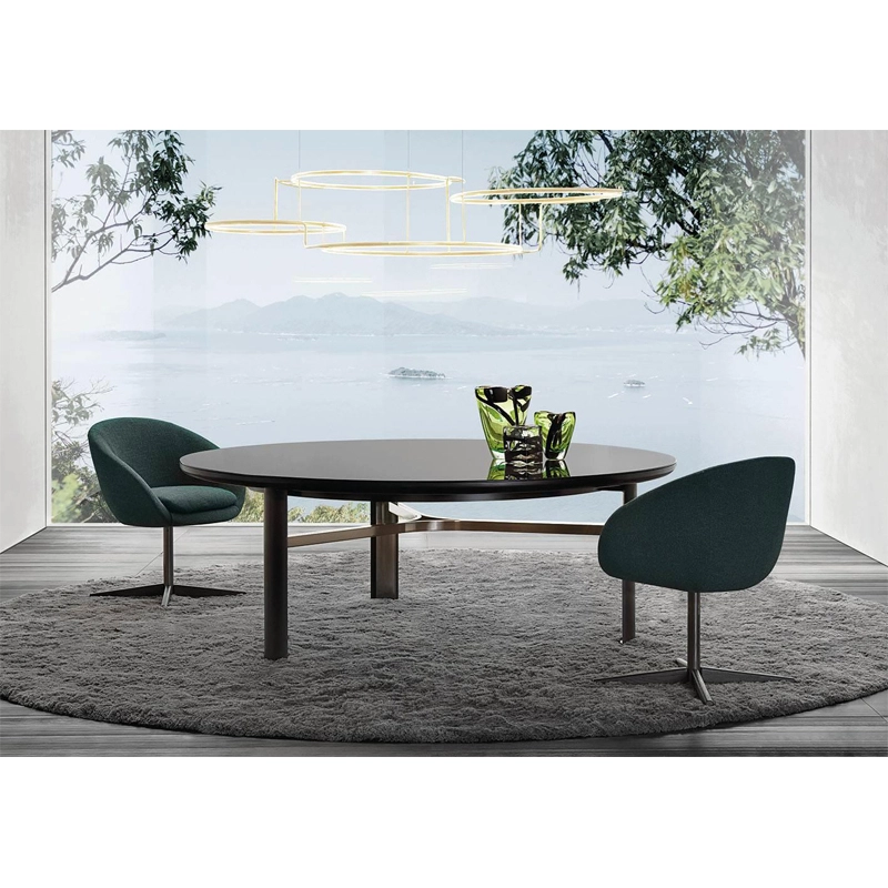 Inspirée du mouvement minimaliste, la table Dan allie le savoir-faire de Minotti à la créativité de Christophe Delcourt, en prenant pour point de départ le cercle. Le designer décompose la forme à la manière d'un plasticien pour en étudier les possibilités expressives. Des pieds arrondis et concaves reliés entre eux par une traverse définissent la base et enrichissent ainsi la silhouette générale de la table. Les finitions contrastantes des pieds créent un jeu de lumière intéressant, éclairant la zone située en dessous du plateau, espace généralement plongé dans l’obscurité. Le pourtour de la table Dan reprend les tonalités de la structure dans une subtile variation de matériaux : le bois remplace l'aluminium et serti le précieux plateau en marbre de Calacatta, verre noir laqué à l’arrière, cendré fumé couleur réglisse, gris tourterelle ou ébène mate. Dan est disponible avec un plateau rond dans trois diamètres ou rectangulaire avec des coins souples dans trois dimensions différentes.