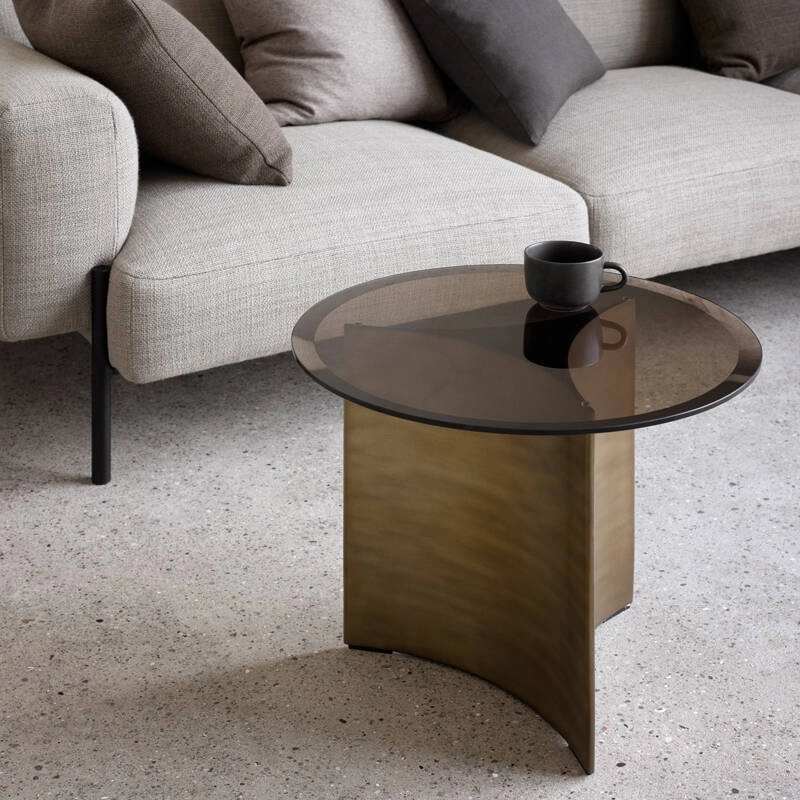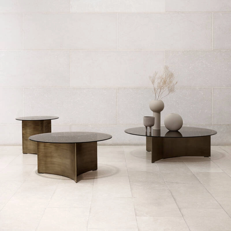La collection de petites tables Arc se distingue par ses formes géométriques. Le plateau rond en verre fumé laisse voir la base très élégante en acier laitonné. Avec sa silhouette sculpturale et ses finitions raffinées, la table basse Arc de Wendelbo apporte une sensation presque magique dans les intérieurs. Les trois tailles disponibles peuvent être utilisées seules ou en composition de plusieurs éléments.