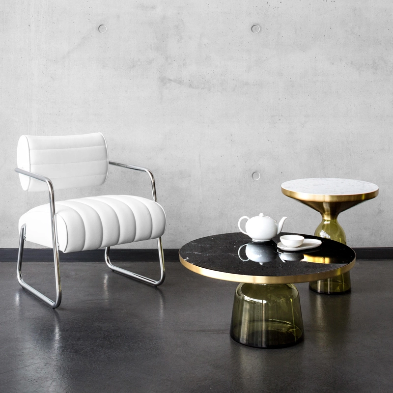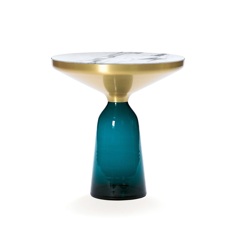 Désormais disponible avec un plateau en marbre, la collection Bell Table de Sebastian Herkner bouleverse l'usage habituel des matériaux en associant le verre, matériau léger et fragile utilisé pour la base, et un plateau réalisé en métal, qui semble flotter au-dessus. Le piétement en verre teinté est soufflé de façon traditionnelle dans un moule en bois. Avec sa présence sculpturale, il contraste avec le cadre en laiton tout en formant une unité harmonieuse rappelant les courbes d'une cloche. Grâce à ses surfaces réfléchissantes et ses matériaux opposés, la