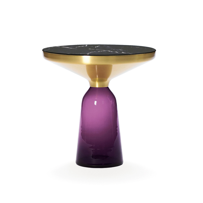 Désormais disponible avec un plateau en marbre, la collection Bell Table de Sebastian Herkner bouleverse l'usage habituel des matériaux en associant le verre, matériau léger et fragile utilisé pour la base, et un plateau réalisé en métal, qui semble flotter au-dessus. Le piétement en verre teinté est soufflé de façon traditionnelle dans un moule en bois. Avec sa présence sculpturale, il contraste avec le cadre en laiton tout en formant une unité harmonieuse rappelant les courbes d'une cloche. Grâce à ses surfaces réfléchissantes et ses matériaux opposés, la Bell Table ajoute une touche raffinée et délicate dans le salon. Elle célèbre la beauté des matériaux avec leurs couleurs et leurs formes, associées aux qualités d'un travail artisanal rigoureux. La table basse Bell Coffee et la table d'appoint Bell Side sont des pièces uniques et fragiles, chacune étant réalisée intégralement à la main et éditée par Classicon.