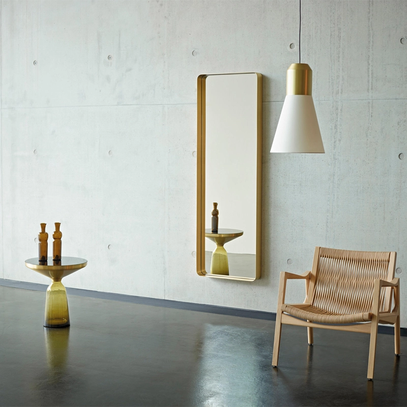 La collection Bell Table de Sebastian Herkner bouleverse l'usage habituel des matériaux en associant le verre, matériau léger et fragile utilisé pour la base, et un plateau réalisé en métal, qui semble flotter au-dessus. Le piétement en verre teinté est soufflé de façon traditionnelle dans un moule en bois. Avec sa présence sculpturale, Bell Side Table contraste avec le cadre en laiton tout en formant une unité harmonieuse rappelant les courbes d'une cloche. Grâce à ses surfaces réfléchissantes et ses matériaux opposés, la Bell Side Table ajoute une touche raffinée et délicate dans le salon. Elle célèbre la beauté des matériaux avec leurs couleurs et leurs formes, associées aux qualités d'un travail artisanal rigoureux. La table basse Bell Coffee et la table d'appoint Bell Side sont des pièces uniques et fragiles, chacune étant réalisée intégralement à la main et éditée par Classicon.