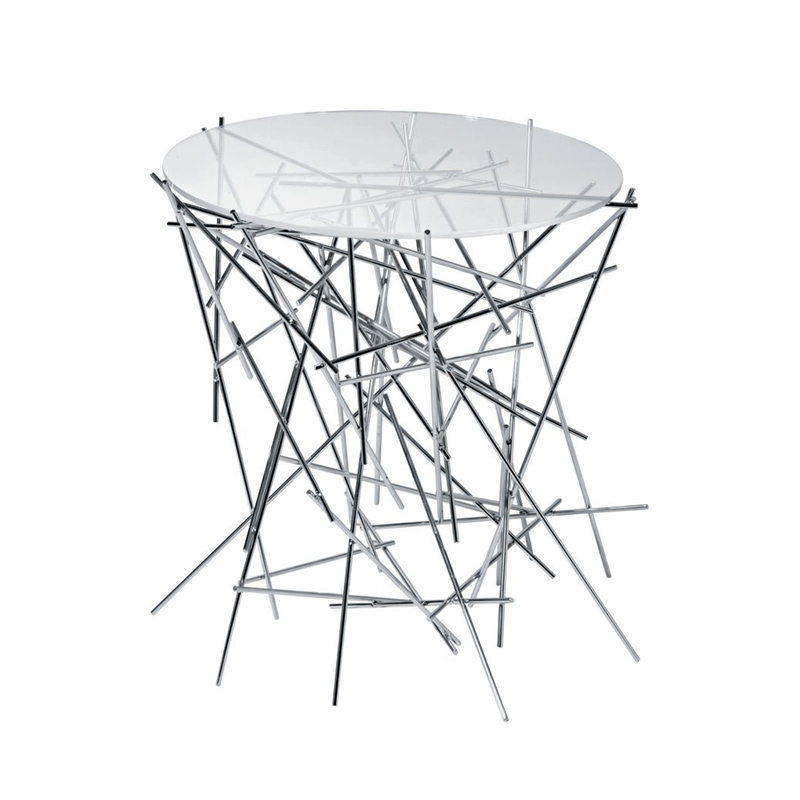 Cette petite table fait partie de la collection Blow up, dessinée par les frères Fernando et Humberto Campana et éditée par Alessi. Les formes si particulières de cette collection sont créées par les bâtonnets d'acier qui semblent avoir été assemblés au hasard , trait qui est caractéristique à de nombreux projets de ces designers brésiliens. Le plateau en verre vient se poser délicatement sur la structure en acier chromé qui joue sur les pleins et les vides. Cette petite table d'appoint au caractère sculptural s'intègre parfaitement  dans un salon en bout de canapé par exemple.