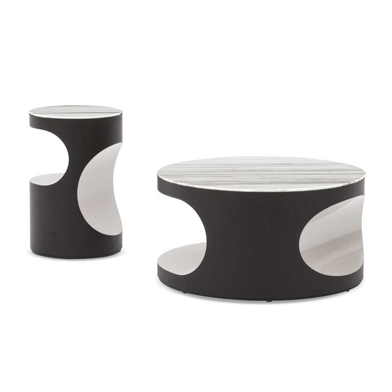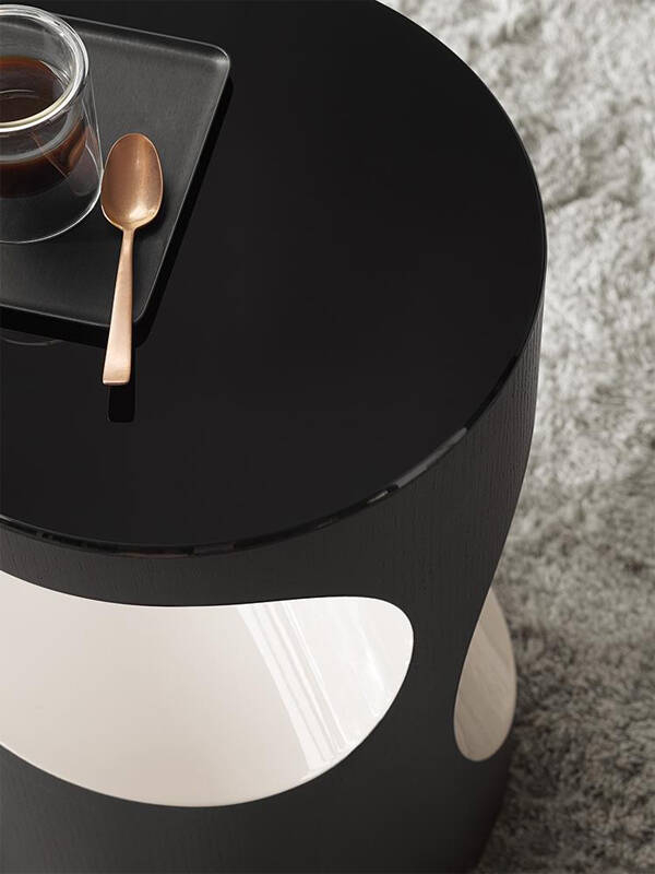 Boden est une collection de petites tables aux silhouettes organiques. La table d'appoint et la table basse sont constituées d'un volume compact et excavé qui joue avec les pleins et les vides, les formes concaves et convexes, les contrastes entre la surface interne laquée brillante couleur sable et l'extérieur de couleur moka opaque.