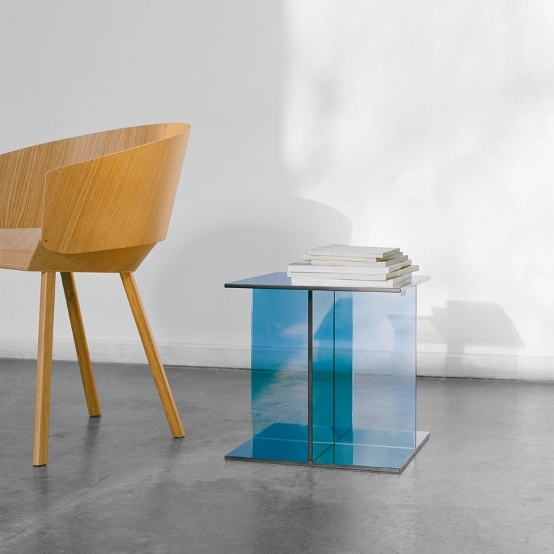Philipp Mainzer dessine pour la marque  E15,  une série de petites tables réalisées en verre coloré : Drei et Vier. Composée de quatre panneaux de verre, la version Drei peut être utilisée dans n'importe quel sens, faisant référence aux formes épurée du Bauhaus et au tabouret Ulm. Conçue après la Drei, la table Vier est réalisée à partir de cinq pièces de verre et peut servir de rangement grâce à sa base symétrique découpée en quatre parties.
