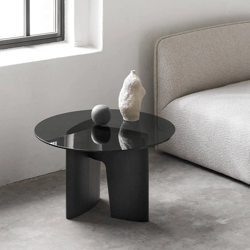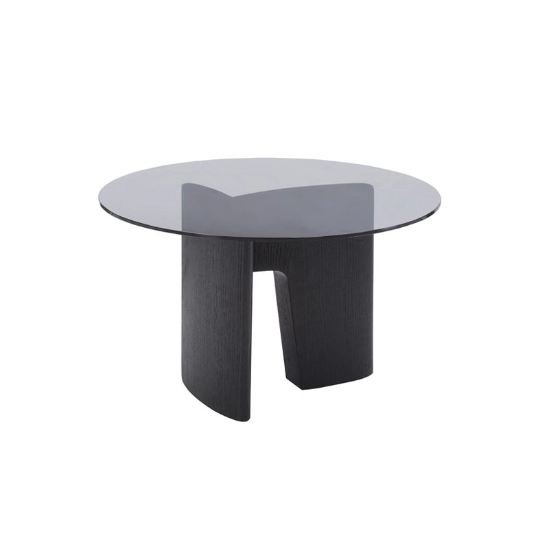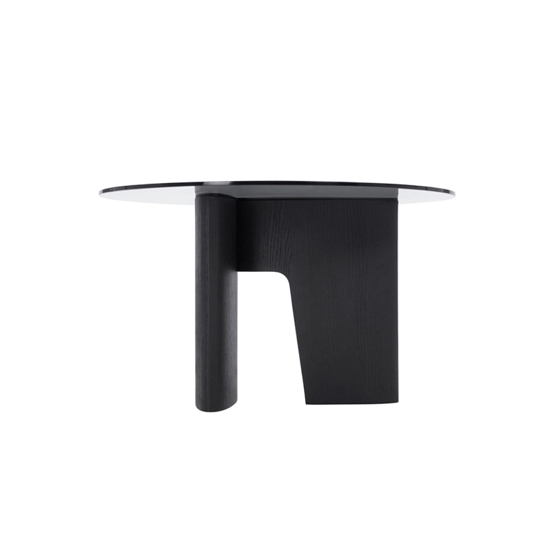 Wendelbo, la table d'appoint Glyph est dotée d'un plateau en verre trempé teinté noir qui semble flotter tout en révélant la coupe transversale caractéristique de la base. Fabriquée en placage de chêne teinté noir, la base de la table